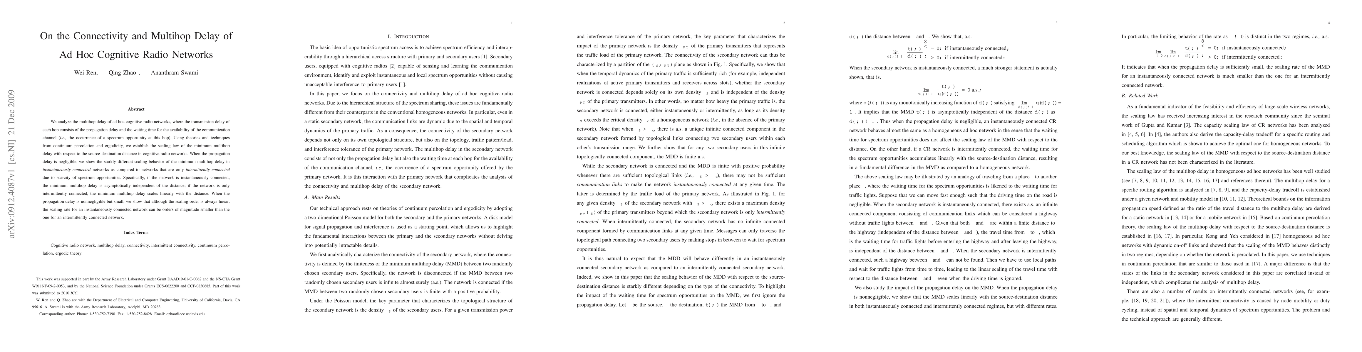 This paper analyzes the multihop delay in ad hoc cognitive radio networks, revealing that the minimum delay scales differently depending on network connectivity. For networks with constant connectivity, the delay is distance-independent, while intermittently connected networks show linear scaling with distance.