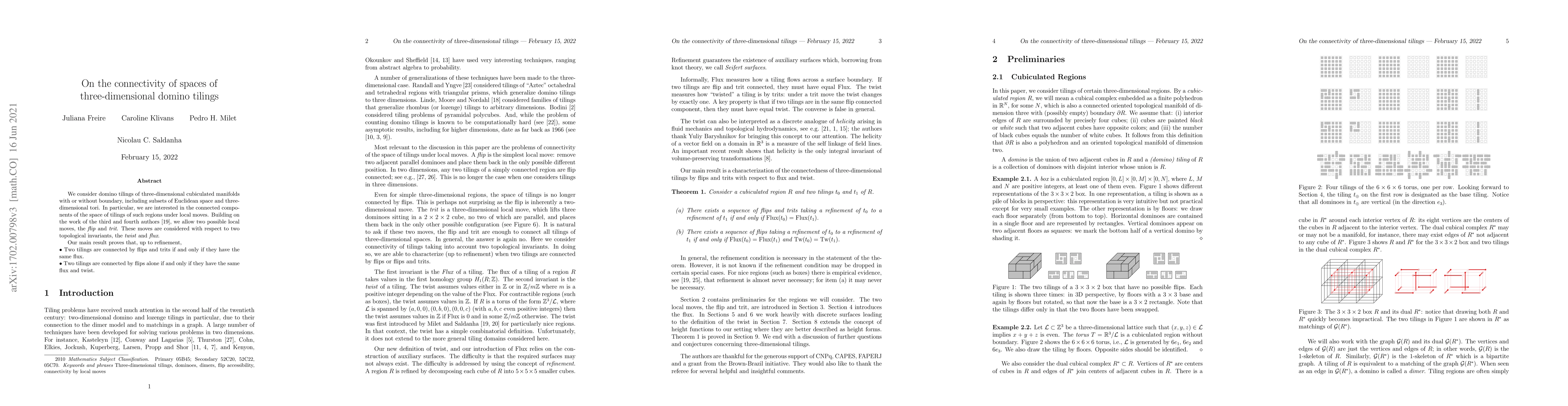 This paper investigates the connectivity of spaces of three-dimensional tilings using local moves like flips and trits, focusing on cubiculated manifolds. It proves that tilings are connected by flips and trits if they share the same flux, and by flips alone if they also share the same flux and twist.