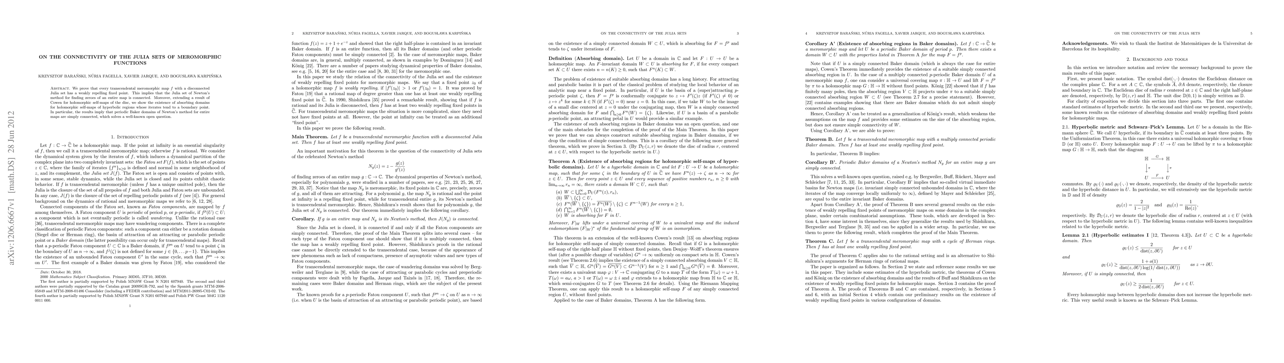 This paper proves that transcendental meromorphic maps with disconnected Julia sets have weakly repelling fixed points, ensuring the connectivity of Julia sets in Newton's method for entire maps. It also extends results on absorbing domains for holomorphic self-maps of hyperbolic regions, solving an open question about the simple connectivity of periodic Baker domains.