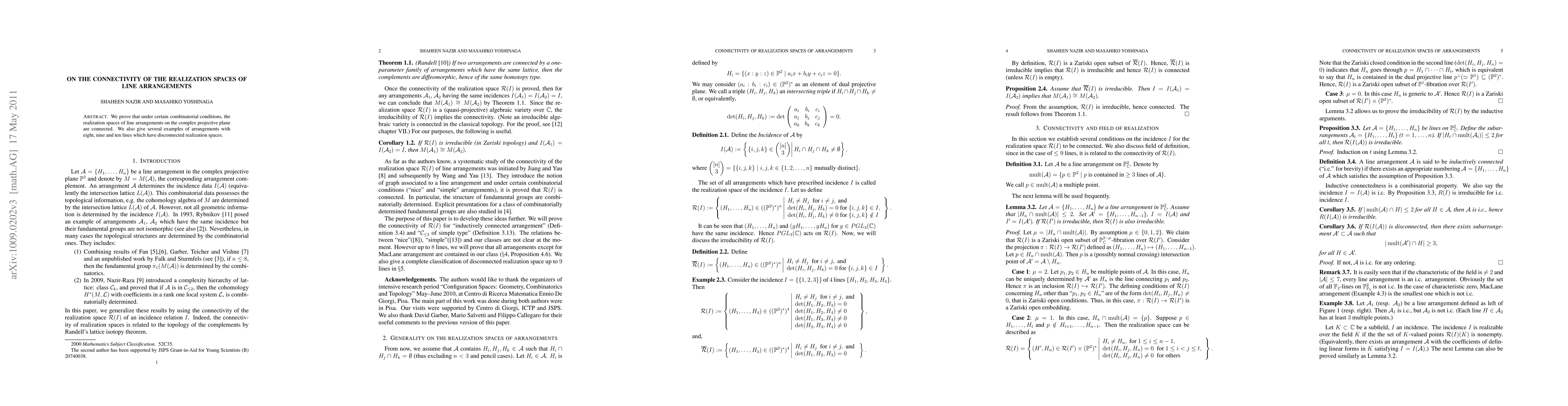 This paper proves that specific combinatorial conditions ensure the connectivity of realization spaces for line arrangements on the complex projective plane, while also providing examples of arrangements with eight, nine, and ten lines that result in disconnected realization spaces.