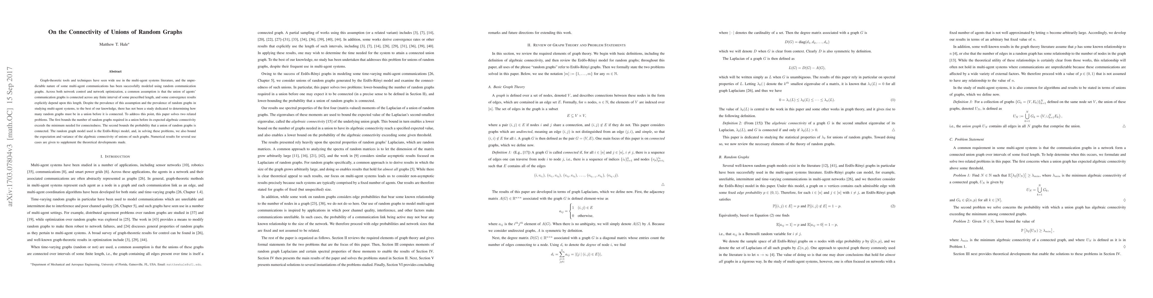 Researchers studied how many random graphs need to be combined before they become connected, finding that a certain number is required for expected algebraic connectivity to exceed the minimum needed for connection.