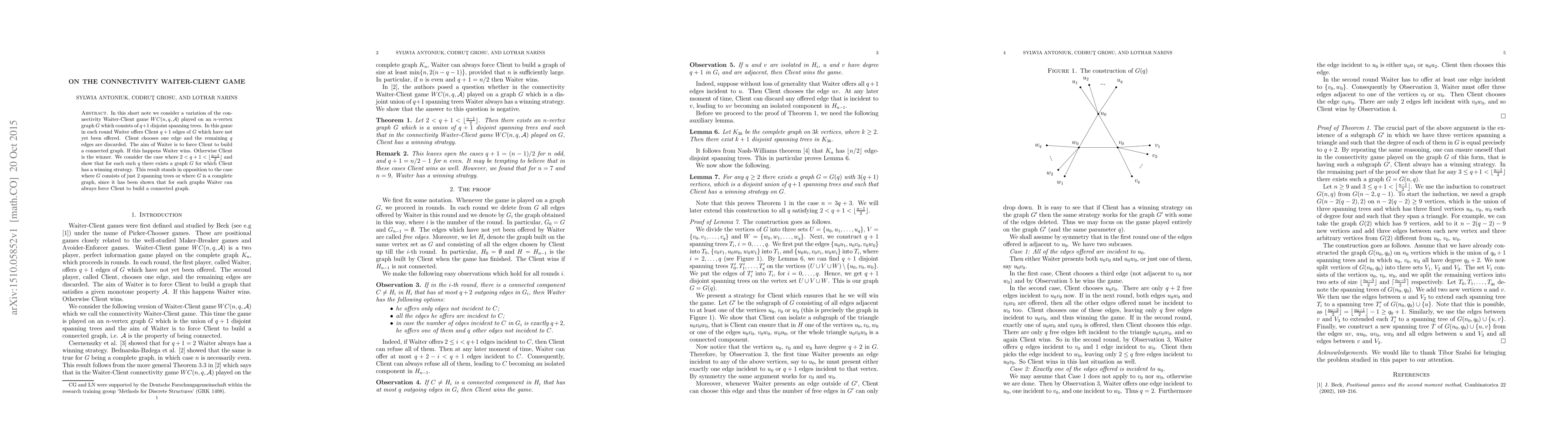 Researchers show that in a variation of the connectivity Waiter-Client game, Client can win even when faced with 2+ disjoint spanning trees, contradicting previous results for smaller graph configurations.