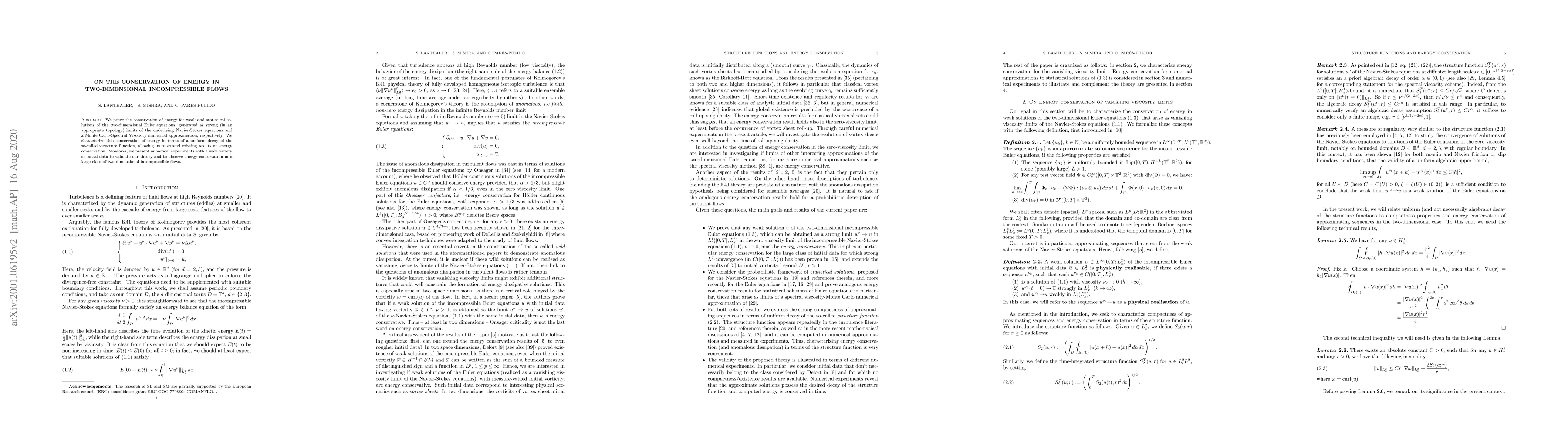 We prove the conservation of energy for weak and statistical solutions of the two-dimensional Euler equations, generated as strong (in an appropriate topology) limits of the underlying Navier-Stokes equations and a Monte Carlo-Spectral Viscosity numerical approximation, respectively. We characterize this conservation of energy in terms of a uniform decay of the so-called structure function, allowing us to extend existing results on energy conservation. Moreover, we present numerical experiments with a wide variety of initial data to validate our theory and to observe energy conservation in a large class of two-dimensional incompressible flows.