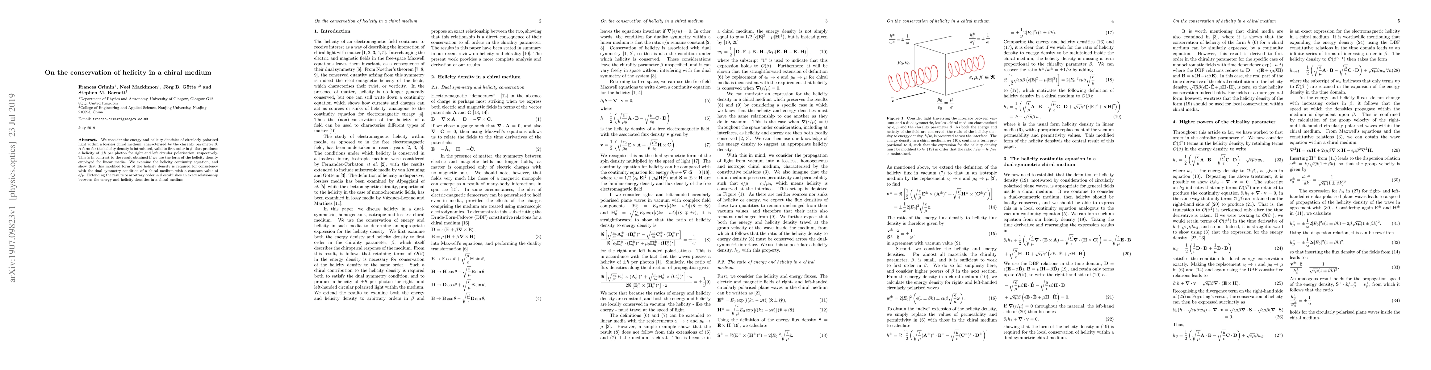 We consider the energy and helicity densities of circularly polarised light within a lossless chiral medium, characterised by the chirality parameter $\beta$. A form for the helicity density is introduced, valid to first order in $\beta$, that produces a helicity of $\pm\hbar$ per photon for right and left circular polarisation, respectively. This is in contrast to the result obtained if we use the form of the helicity density employed for linear media. We examine the helicity continuity equation, and show that this modified form of the helicity density is required for consistency with the dual symmetry condition of a chiral medium with a constant value of ${\epsilon}/{\mu}$. Extending the results to arbitrary order in $\beta$ establishes an exact relationship between the energy and helicity densities in a chiral medium.