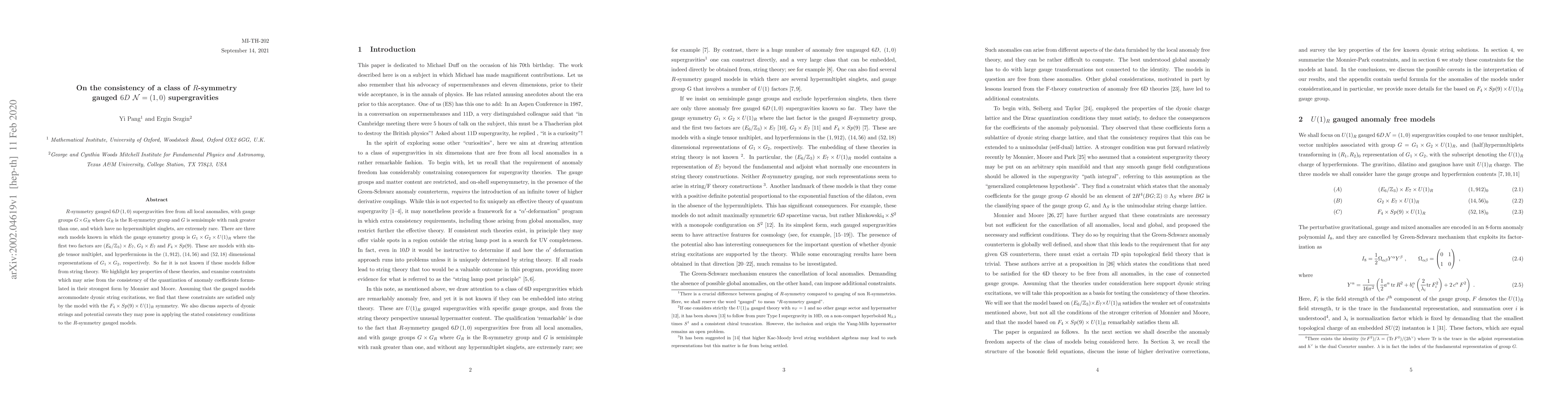 R-symmetry gauged 6D (1,0) supergravities free from all local anomalies, with gauge groups $G\times G_R$ where $G_R$ is the R-symmetry group and $G$ is semisimple with rank greater than one, and which have no hypermultiplet singlets, are extremely rare. There are three such models known in which the gauge symmetry group is $G_1\times G_2 \times U(1)_R$ where the first two factors are $ \left(E_6/{\mathbb{Z}_3}\right) \times E_7$, $ G_2 \times E_7 $ and $F_4 \times Sp(9)$. These are models with single tensor multiplet, and hyperfermions in the $(1,912)$, $(14,56)$ and $(52,18)$ dimensional representations of $G_1\times G_2$, respectively. So far it is not known if these models follow from string theory. We highlight key properties of these theories, and examine constraints which may arise from the consistency of the quantization of anomaly coefficients formulated in their strongest form by Monnier and Moore. Assuming that the gauged models accommodate dyonic string excitations, we find that these constraints are satisfied only by the model with the $F_4 \times Sp(9)\times U(1)_R$ symmetry. We also discuss aspects of dyonic strings and potential caveats they may pose in applying the stated consistency conditions to the $R$-symmetry gauged models.