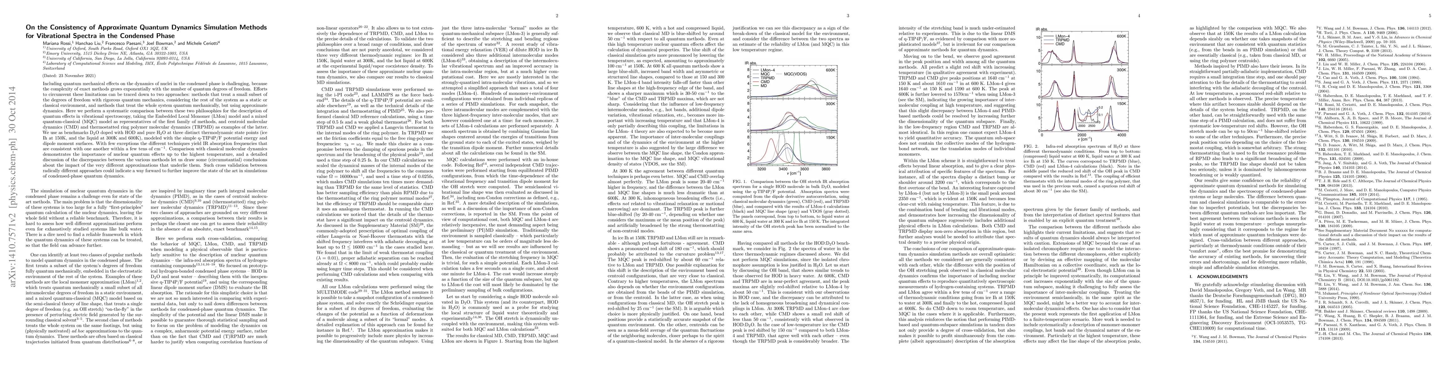 Including quantum mechanical effects on the dynamics of nuclei in the condensed phase is challenging, because the complexity of exact methods grows exponentially with the number of quantum degrees of freedom. Efforts to circumvent these limitations can be traced down to two approaches: methods that treat a small subset of the degrees of freedom with rigorous quantum mechanics, considering the rest of the system as a static or classical environment, and methods that treat the whole system quantum mechanically, but using approximate dynamics. Here we perform a systematic comparison between these two philosophies for the description of quantum effects in vibrational spectroscopy, taking the Embedded Local Monomer (LMon) model and a mixed quantum-classical (MQC) model as representatives of the first family of methods, and centroid molecular dynamics (CMD) and thermostatted ring polymer molecular dynamics (TRPMD) as examples of the latter. We use as benchmarks D$_2$O doped with HOD and pure H$_2$O at three distinct thermodynamic state points (ice Ih at 150K, and the liquid at 300K and 600K), modeled with the simple q-TIP4P/F potential energy and dipole moment surfaces. With few exceptions the different techniques yield IR absorption frequencies that are consistent with one another within a few tens of cm$^{-1}$. Comparison with classical molecular dynamics demonstrates the importance of nuclear quantum effects up to the highest temperature, and a detailed discussion of the discrepancies between the various methods let us draw some (circumstantial) conclusions about the impact of the very different approximations that underlie them. Such cross validation between radically different approaches could indicate a way forward to further improve the state of the art in simulations of condensed-phase quantum dynamics.