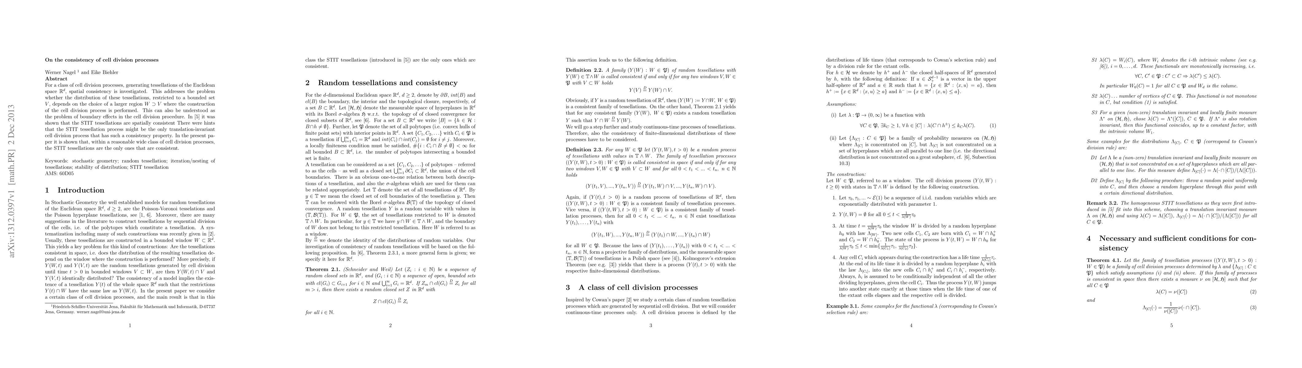 Researchers investigate cell division processes and find that only specific tessellations (STIT) are spatially consistent, meaning their distribution doesn't depend on the surrounding area.