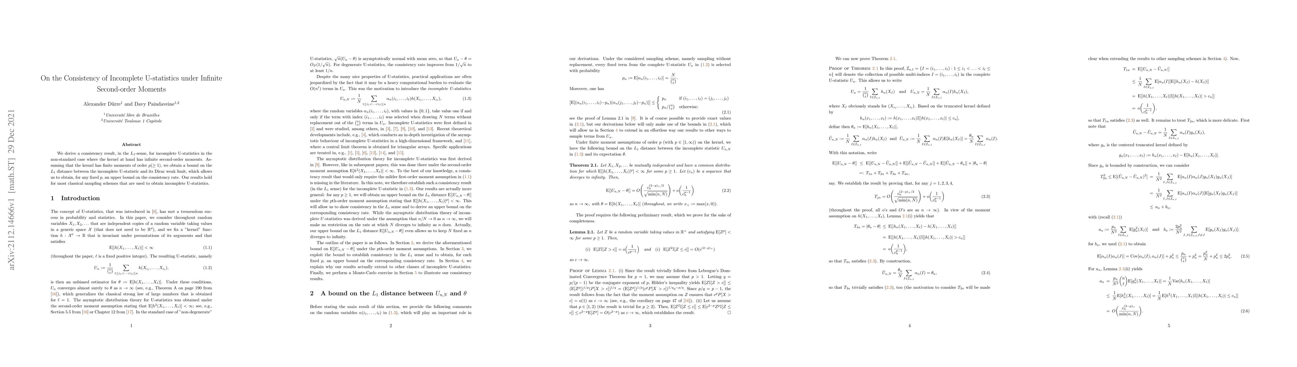 This paper establishes a consistency result for incomplete U-statistics under non-standard conditions where the kernel has infinite second-order moments. It provides an $L_1$ bound on the distance between the incomplete U-statistic and its limit, allowing for an upper bound on the consistency rate for any finite moment order $p \geq 1$.