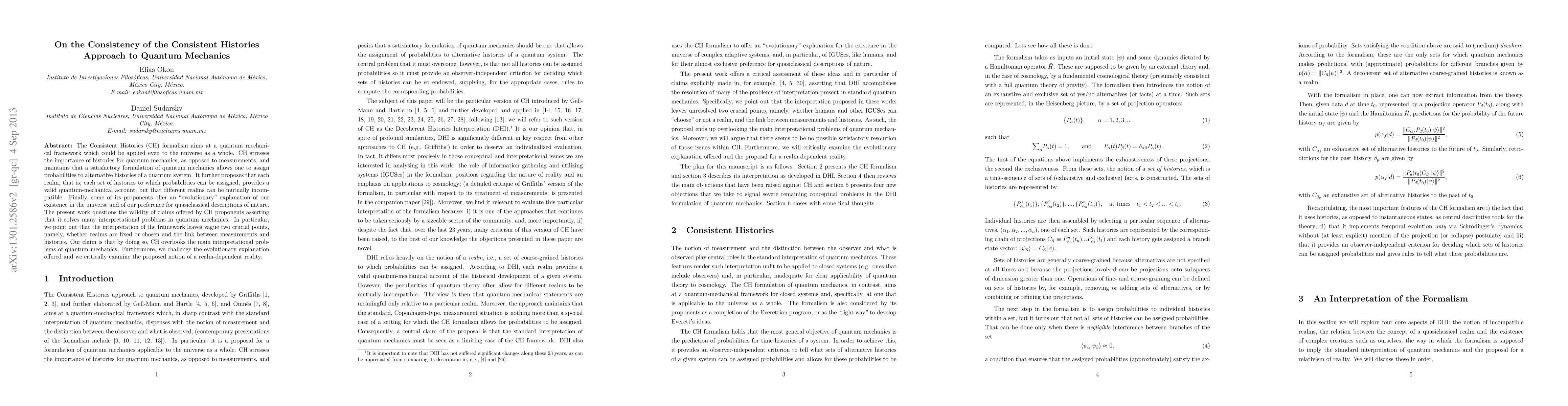 This paper critiques the Consistent Histories (CH) framework in quantum mechanics, arguing that it fails to resolve key interpretational issues by leaving ambiguous whether realms are fixed or chosen and the connection between measurements and histories. It also challenges the CH proponents' evolutionary explanation and the notion of realm-dependent reality.