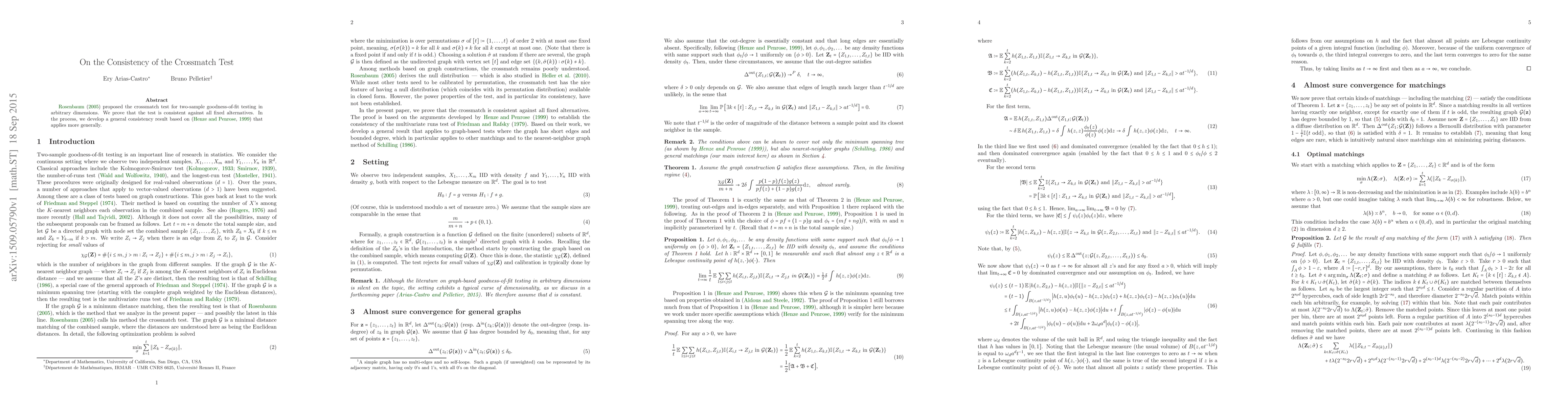 This paper proves the consistency of Rosenbaum's (2005) crossmatch test for two-sample goodness-of-fit in any dimension against all fixed alternatives, building on a general consistency result from Henze & Penrose (1999).