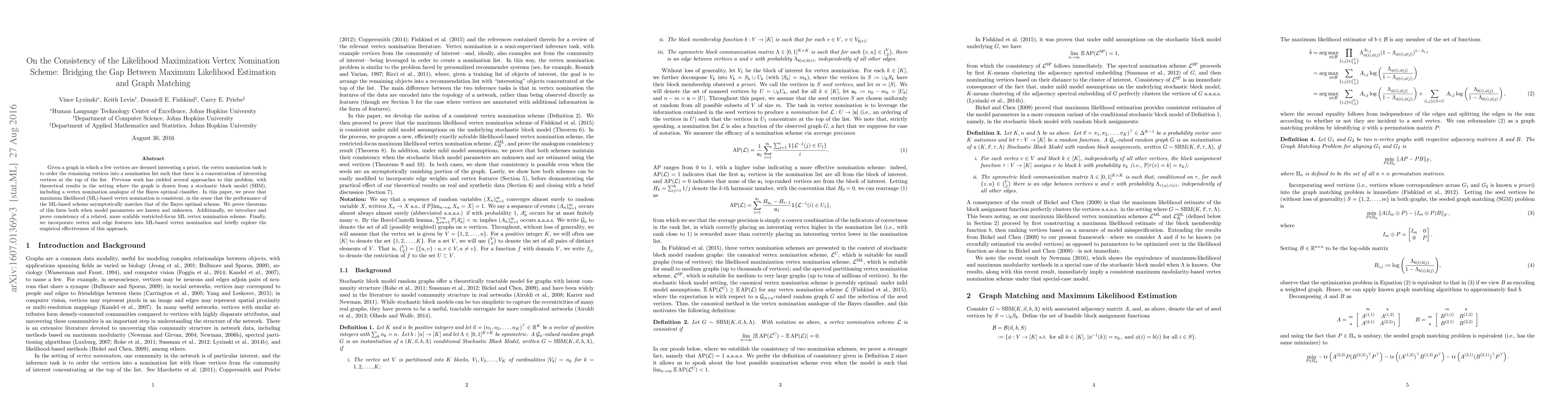 Given a graph in which a few vertices are deemed interesting a priori, the vertex nomination task is to order the remaining vertices into a nomination list such that there is a concentration of interesting vertices at the top of the list. Previous work has yielded several approaches to this problem, with theoretical results in the setting where the graph is drawn from a stochastic block model (SBM), including a vertex nomination analogue of the Bayes optimal classifier. In this paper, we prove that maximum likelihood (ML)-based vertex nomination is consistent, in the sense that the performance of the ML-based scheme asymptotically matches that of the Bayes optimal scheme. We prove theorems of this form both when model parameters are known and unknown. Additionally, we introduce and prove consistency of a related, more scalable restricted-focus ML vertex nomination scheme. Finally, we incorporate vertex and edge features into ML-based vertex nomination and briefly explore the empirical effectiveness of this approach.