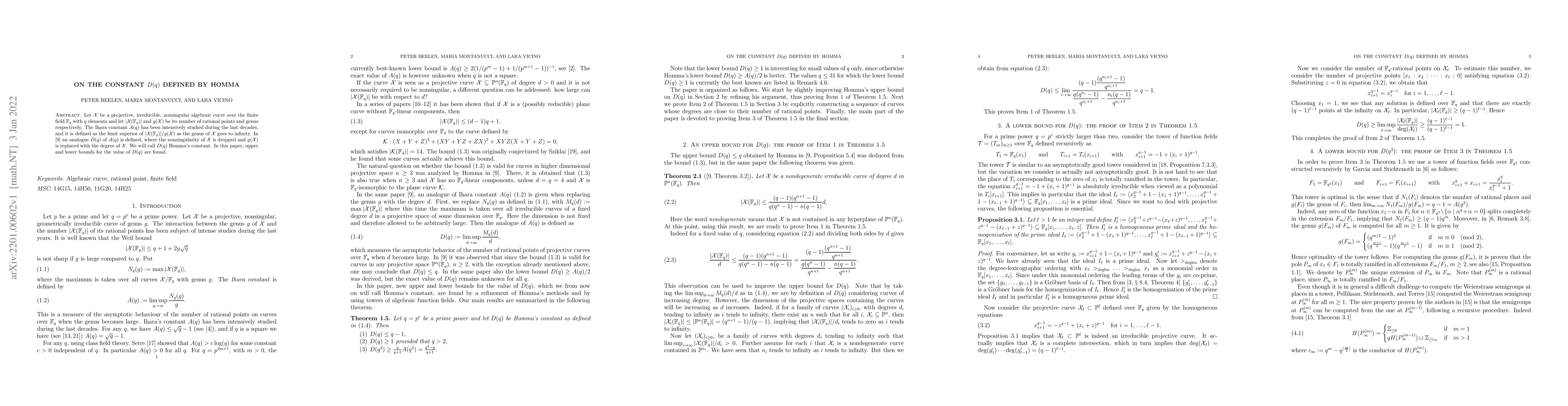 Let $\mathcal{X}$ be a projective, irreducible, nonsingular algebraic curve over the finite field $\mathbb{F}_q$ with $q$ elements and let $|\mathcal{X}(\mathbb{F}_q)|$ and $g(\mathcal X)$ be its number of rational points and genus respectively. The Ihara constant $A(q)$ has been intensively studied during the last decades, and it is defined as the limit superior of $|\mathcal{X}(\mathbb{F}_q)|/g(\mathcal X)$ as the genus of $\mathcal X$ goes to infinity. In 2012 Homma defined an analogue $D(q)$ of $A(q)$, where the nonsingularity of $\mathcal X$ is dropped and $g(\mathcal X)$ is replaced with the degree of $\mathcal X$. We will call $D(q)$ Homma's constant. In this paper, upper and lower bounds for the value of $D(q)$ are found.