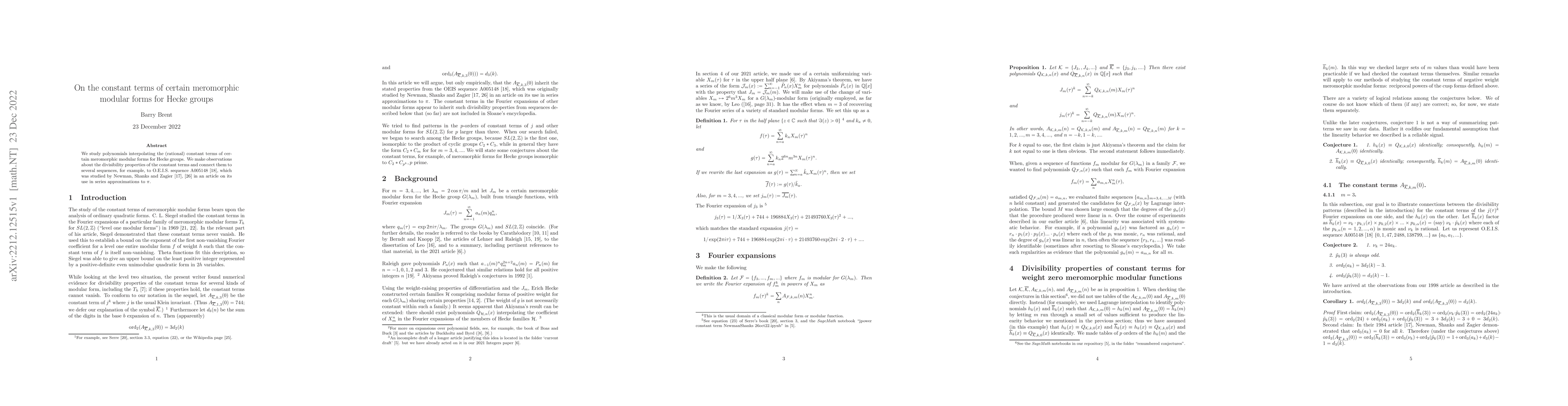 We study polynomials interpolating the (rational) constant terms of certain meromorphic modular forms for Hecke groups. We make observations about the divisibility properties of the constant terms and connect them to several sequences, for example, to O.E.I.S. sequence A005148 \cite{OEISNewmanShanks}, which was studied by Newman, Shanks and Zagier \cite{newman2004sequence}, \cite{newman2004sequenceAppendix} in an article on its use in series approximations to $\pi$.