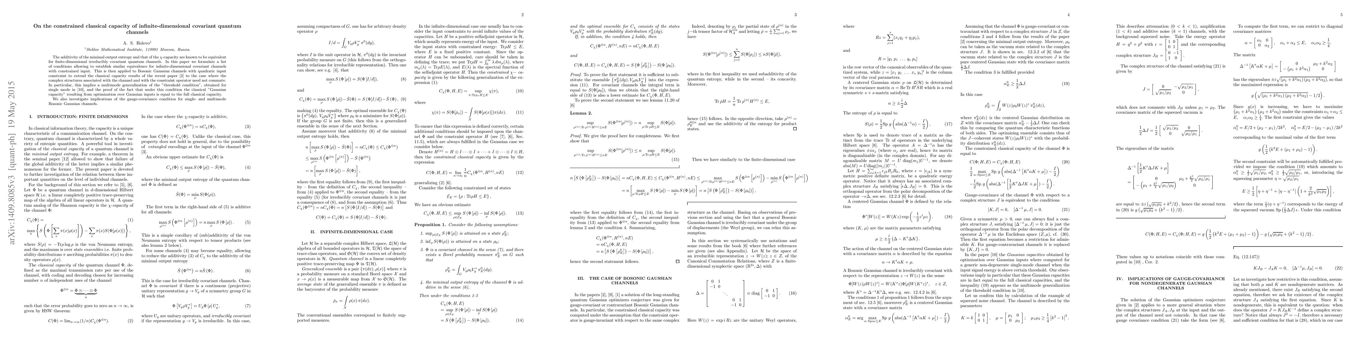 The additivity of the minimal output entropy and that of the $\chi$-capacity are known to be equivalent for finite-dimensional irreducibly covariant channels. In this paper we formulate a list of conditions allowing to establish similar equivalence for infinite-dimensional covariant channels with constrained input. This is then applied to Bosonic Gaussian channels with quadratic input constraint to extend the classical capacity results of the recent paper \cite{ghg} to the case where the complex structures associated with the channel and with the constraint operator need not commute. In particular, this implies a multimode generalization of the "threshold condition", obtained for single mode in \cite{schaefer}) and the proof of the fact that under this condition the classical "Gaussian capacity" resulting from optimization over Gaussian inputs is equal to the full classical capacity. We also investigate implications of the gauge-covariance condition for the single- and multimode Bosonic Gaussian channels.