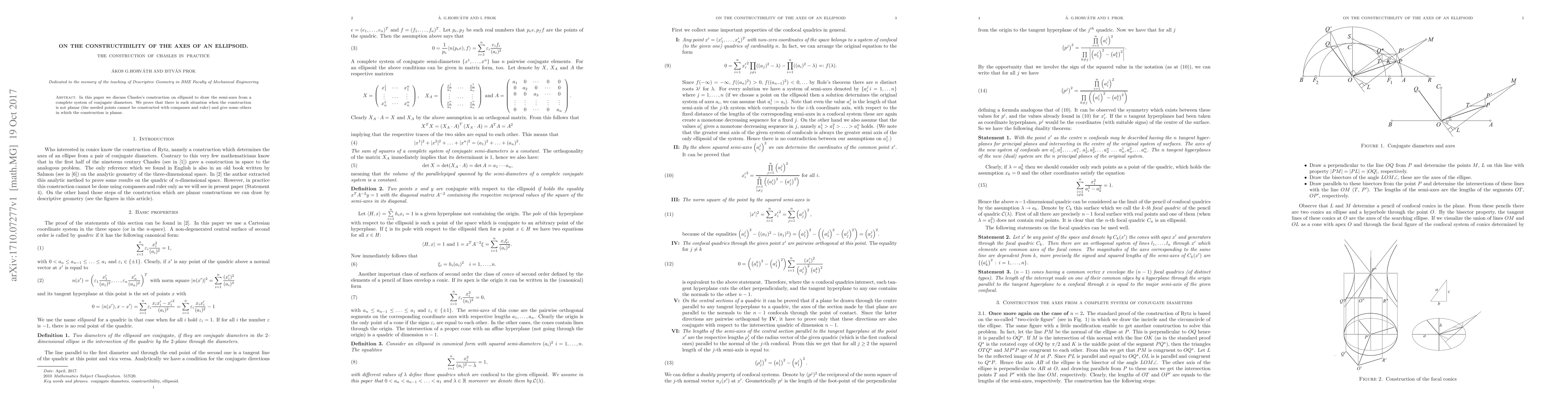 In this paper we discuss Chasles's construction on ellipsoid to draw the semi-axes from a complete system of conjugate diameters. We prove that there is such situation when the construction is not planar (the needed points cannot be constructed with compasses and ruler) and give some others in which the construction is planar.In this paper we discuss Chasles's construction on ellipsoid to draw the semi-axes from a complete system of conjugate diameters. We prove that there is such situation when the construction is not planar (the needed points cannot be constructed with compasses and ruler) and give some others in which the construction is planar.