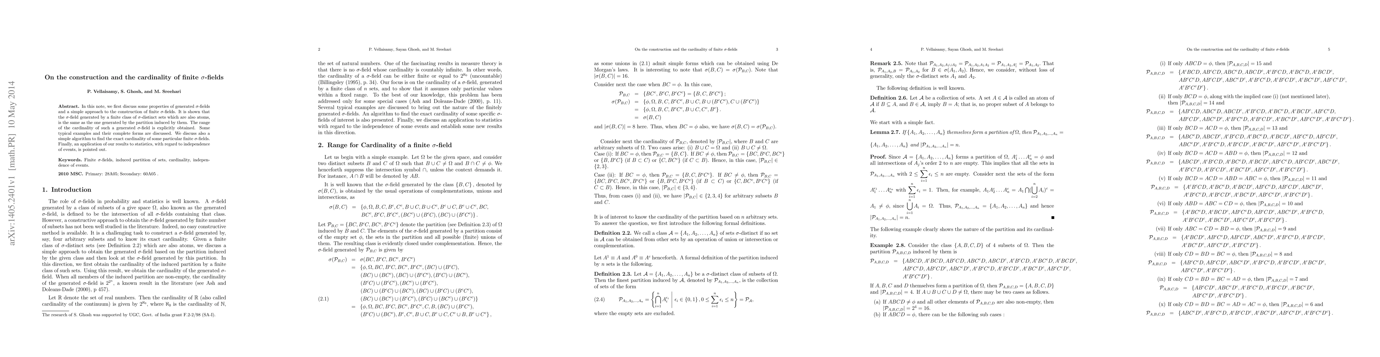 In this note, we first discuss some properties of generated $\sigma$-fields and a simple approach to the construction of finite $\sigma$-fields. It is shown that the $\sigma$-field generated by a finite class of $\sigma$-distinct sets which are also atoms, is the same as the one generated by the partition induced by them. The range of the cardinality of such a generated $\sigma$-field is explicitly obtained. Some typical examples and their complete forms are discussed. We discuss also a simple algorithm to find the exact cardinality of some particular finite $\sigma$-fields. Finally, an application of our results to statistics, with regard to independence of events, is pointed out.