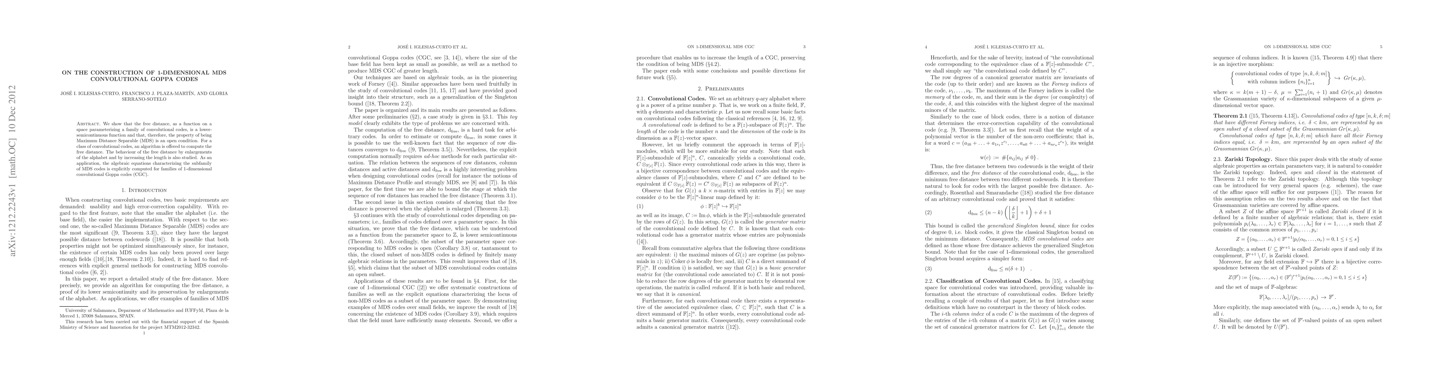We show that the free distance, as a function on a space parameterizing a family of convolutional codes, is a lower-semicontinuous function and that, therefore, the property of being Maximum Distance Separable (MDS) is an open condition. For a class of convolutional codes, an algorithm is offered to compute the free distance. The behaviour of the free distance by enlargements of the alphabet and by increasing the length is also studied. As an application, the algebraic equations characterizing the subfamily of MDS codes is explicitly computed for families of 1-dimensional convolutional Goppa codes (CGC).