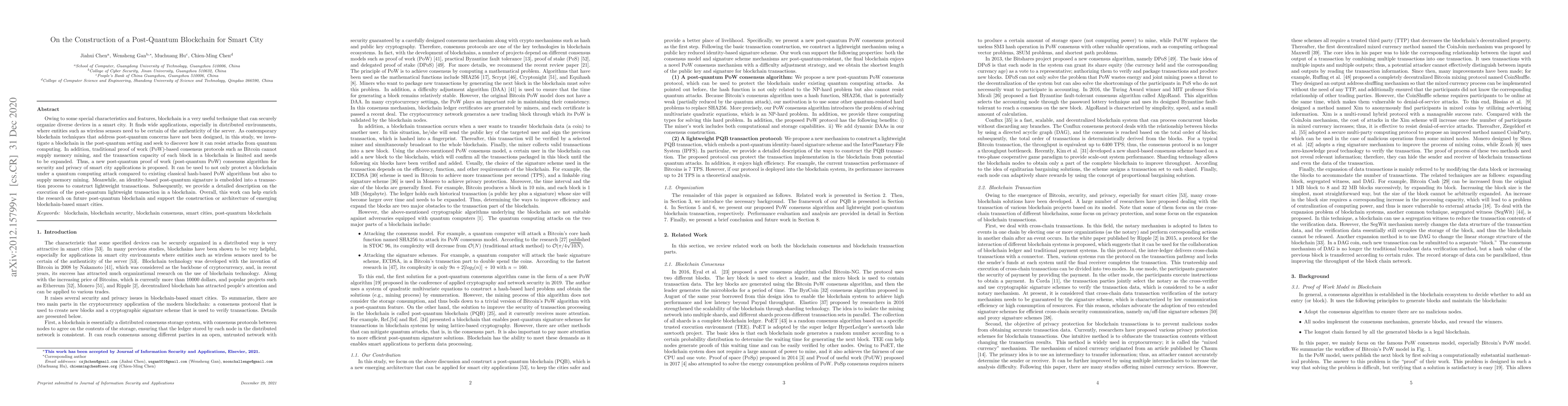 Owing to some special characteristics and features, blockchain is a very useful technique that can securely organize diverse devices in a smart city. It finds wide applications, especially in distributed environments, where entities such as wireless sensors need to be certain of the authenticity of the server. As contemporary blockchain techniques that address post-quantum concerns have not been designed, in this study, we investigate a blockchain in the post-quantum setting and seek to discover how it can resist attacks from quantum computing. In addition, traditional proof of work (PoW)-based consensus protocols such as Bitcoin cannot supply memory mining, and the transaction capacity of each block in a blockchain is limited and needs to be expanded. Thus, a new post-quantum proof of work (post-quantum PoW) consensus algorithm for security and privacy of smart city applications is proposed. It can be used to not only protect a blockchain under a quantum computing attack compared to existing classical hash-based PoW algorithms but also to supply memory mining. Meanwhile, an identity-based post-quantum signature is embedded into a transaction process to construct lightweight transactions. Subsequently, we provide a detailed description on the execution of the post-quantum lightweight transaction in a blockchain. Overall, this work can help enrich the research on future post-quantum blockchain and support the construction or architecture of emerging blockchain-based smart cities.