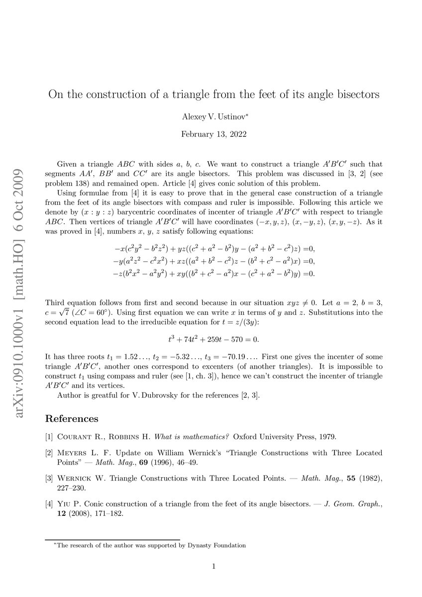 Researchers prove that it is impossible to construct a triangle using only ruler and compass from the feet of its internal angle bisectors.