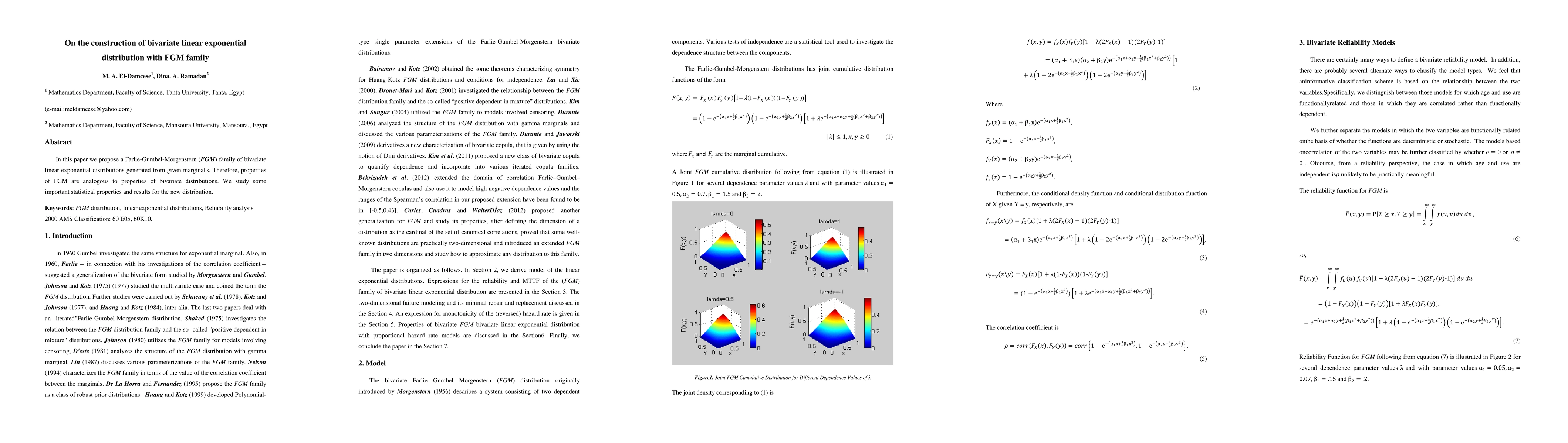 In this paper we propose a Farlie-Gumbel-Morgenstern (FGM) family of bivariate linear exponential distributions generated from given marginal's. Therefore, properties of FGM are analogous to properties of bivariate distributions. We study some important statistical properties and results for the new distribution.