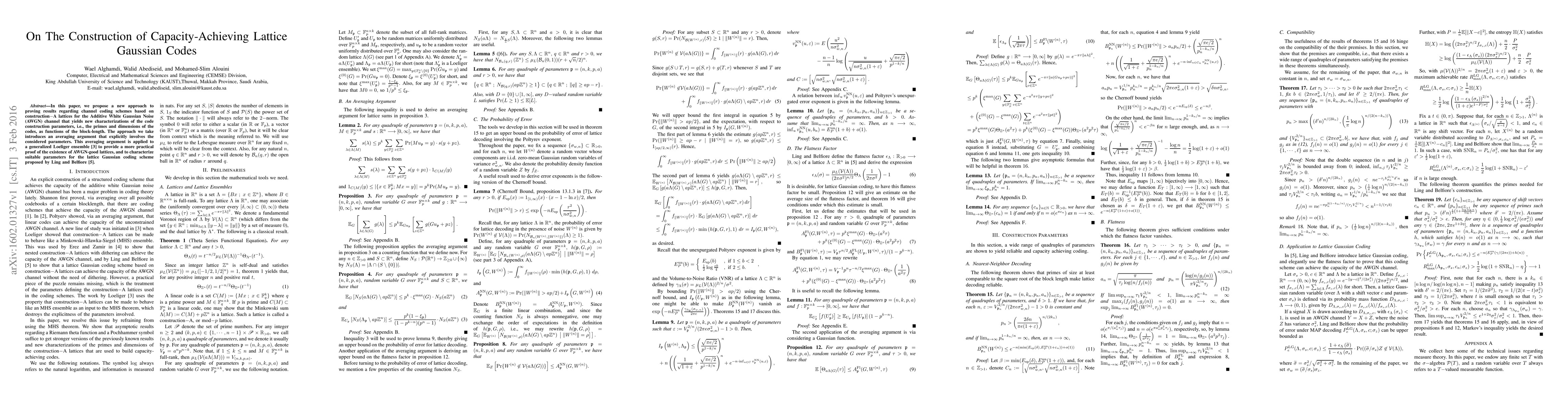 This paper introduces a new method for constructing capacity-achieving lattice Gaussian codes for the AWGN channel, employing an averaging argument to characterize code parameters like primes and dimensions as functions of block-length, and proving the existence of AWGN-good lattices.