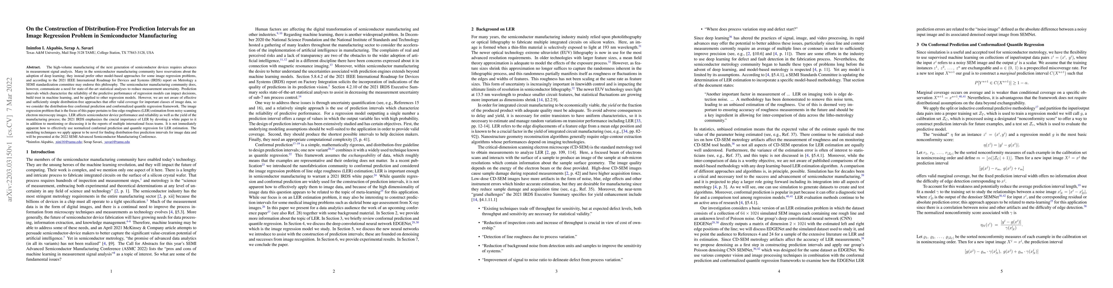 The high-volume manufacturing of the next generation of semiconductor devices requires advances in measurement signal analysis. Many in the semiconductor manufacturing community have reservations about the adoption of deep learning; they instead prefer other model-based approaches for some image regression problems, and according to the 2021 IEEE International Roadmap for Devices and Systems (IRDS) report on Metrology a SEMI standardization committee may endorse this philosophy. The semiconductor manufacturing community does, however, communicate a need for state-of-the-art statistical analyses to reduce measurement uncertainty. Prediction intervals which characterize the reliability of the predictive performance of regression models can impact decisions, build trust in machine learning, and be applied to other regression models. However, we are not aware of effective and sufficiently simple distribution-free approaches that offer valid coverage for important classes of image data, so we consider the distribution-free conformal prediction and conformalized quantile regression framework.The image regression problem that is the focus of this paper pertains to line edge roughness (LER) estimation from noisy scanning electron microscopy images. LER affects semiconductor device performance and reliability as well as the yield of the manufacturing process; the 2021 IRDS emphasizes the crucial importance of LER by devoting a white paper to it in addition to mentioning or discussing it in the reports of multiple international focus teams. It is not immediately apparent how to effectively use normalized conformal prediction and quantile regression for LER estimation. The modeling techniques we apply appear to be novel for finding distribution-free prediction intervals for image data and will be presented at the 2022 SEMI Advanced Semiconductor Manufacturing Conference.