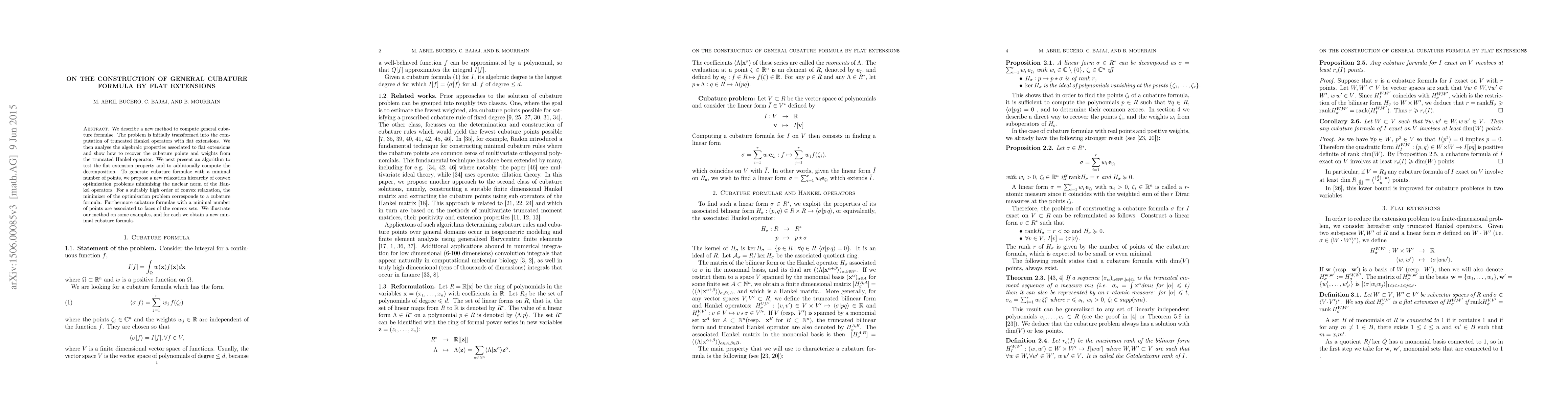 A new method for constructing general cubature formulas is proposed using flat extensions of Hankel operators, resulting in minimal points cubature formulae with a relaxation hierarchy of convex optimization problems.