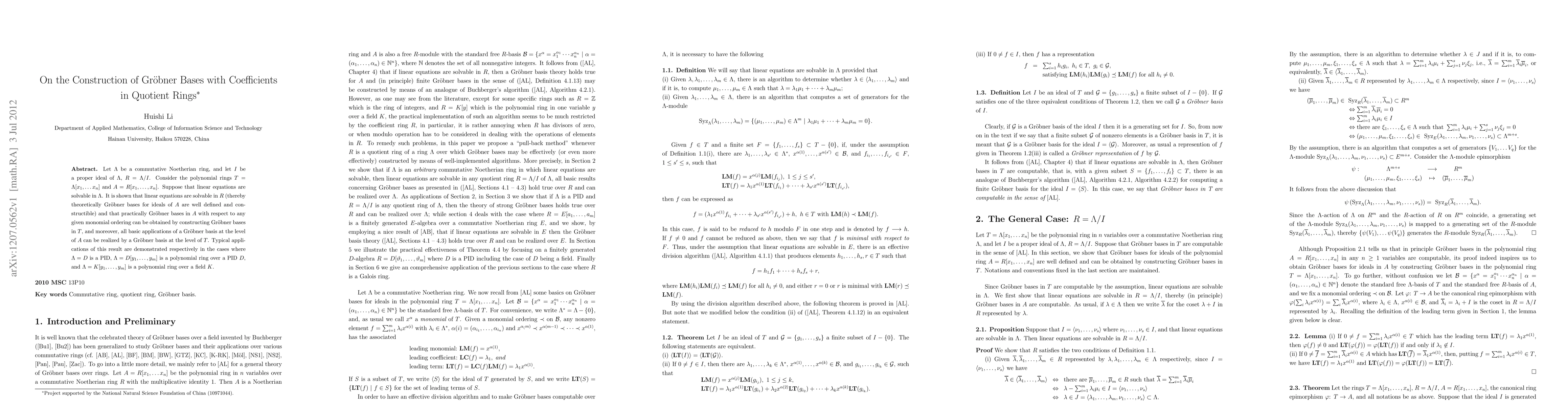 This paper demonstrates that linear equations solvable in a commutative Noetherian ring $\Lambda$ remain solvable in the quotient ring $R=\Lambda /I$, ensuring the constructibility of Gröbner bases for ideals in $A=R[x_1,...,x_n]$. It shows practical Gröbner bases in $A$ can be derived from those in $T=\Lambda[x_1,...,x_n]$ and highlights applications in polynomial rings over PIDs and fields.