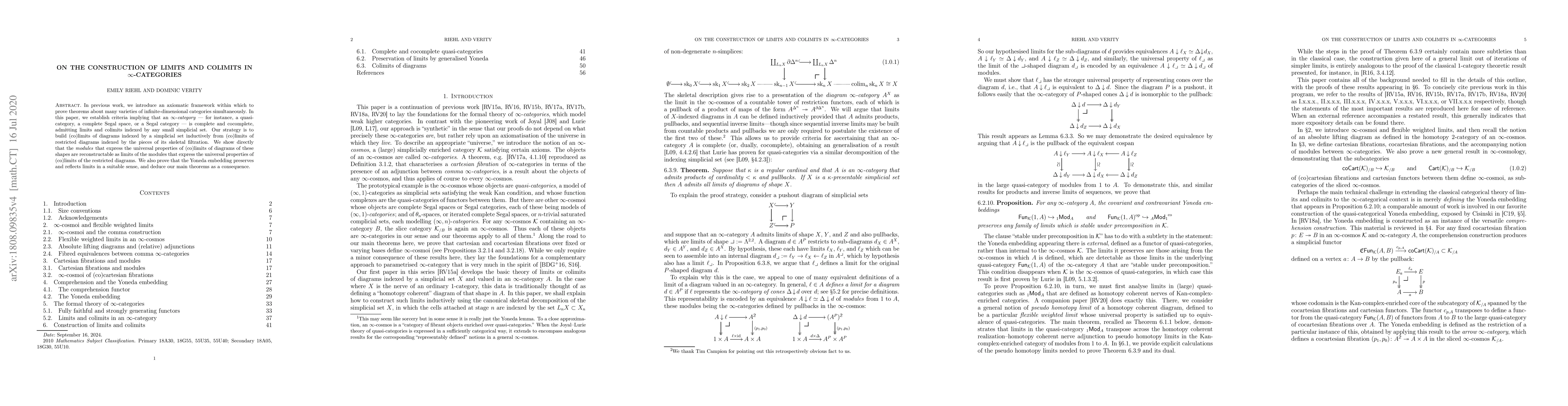 In previous work, we introduce an axiomatic framework within which to prove theorems about many varieties of infinite-dimensional categories simultaneously. In this paper, we establish criteria implying that an $\infty$-category - for instance, a quasi-category, a complete Segal space, or a Segal category - is complete and cocomplete, admitting limits and colimits indexed by any small simplicial set. Our strategy is to build (co)limits of diagrams indexed by a simplicial set inductively from (co)limits of restricted diagrams indexed by the pieces of its skeletal filtration. We show directly that the modules that express the universal properties of (co)limits of diagrams of these shapes are reconstructable as limits of the modules that express the universal properties of (co)limits of the restricted diagrams. We also prove that the Yoneda embedding preserves and reflects limits in a suitable sense, and deduce our main theorems as a consequence.