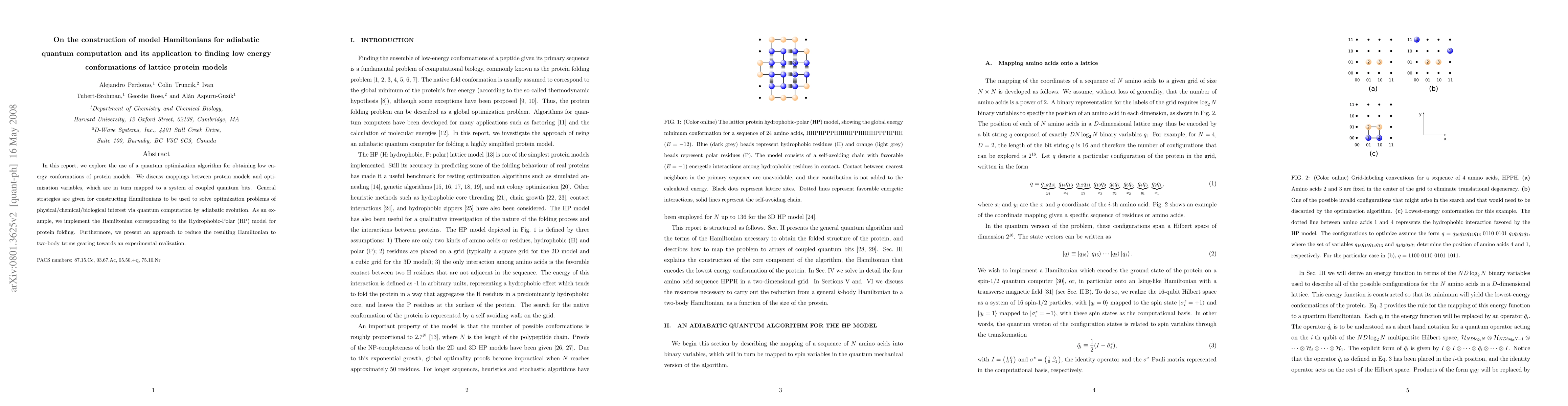 In this report, we explore the use of a quantum optimization algorithm for obtaining low energy conformations of protein models. We discuss mappings between protein models and optimization variables, which are in turn mapped to a system of coupled quantum bits. General strategies are given for constructing Hamiltonians to be used to solve optimization problems of physical/chemical/biological interest via quantum computation by adiabatic evolution. As an example, we implement the Hamiltonian corresponding to the Hydrophobic-Polar (HP) model for protein folding. Furthermore, we present an approach to reduce the resulting Hamiltonian to two-body terms gearing towards an experimental realization.