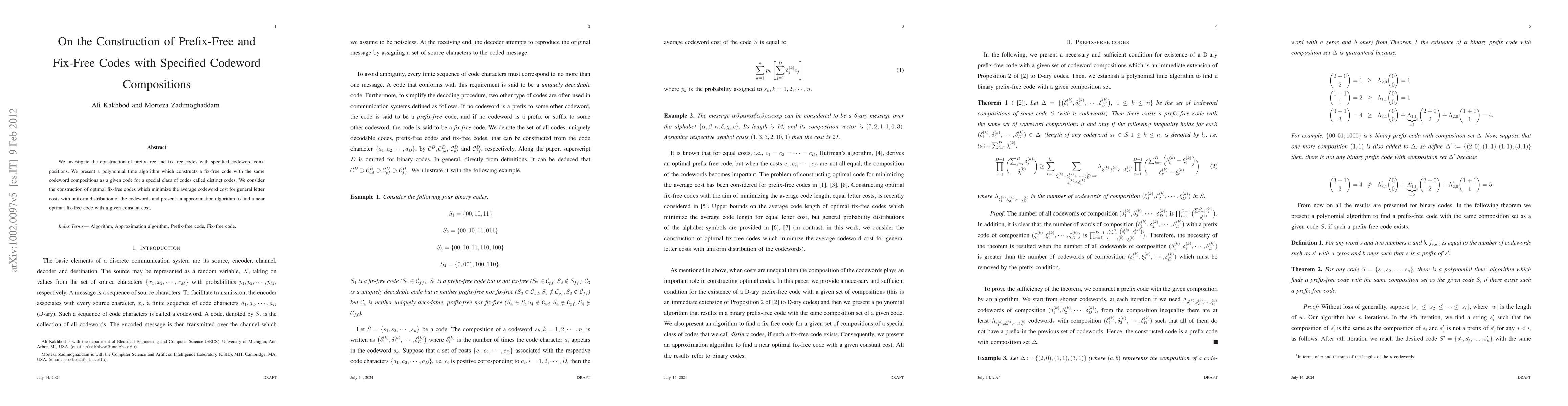We investigate the construction of prefix-free and fix-free codes with specified codeword compositions. We present a polynomial time algorithm which constructs a fix-free code with the same codeword compositions as a given code for a special class of codes called distinct codes. We consider the construction of optimal fix-free codes which minimizes the average codeword cost for general letter costs with uniform distribution of the codewords and present an approximation algorithm to find a near optimal fix-free code with a given constant cost.