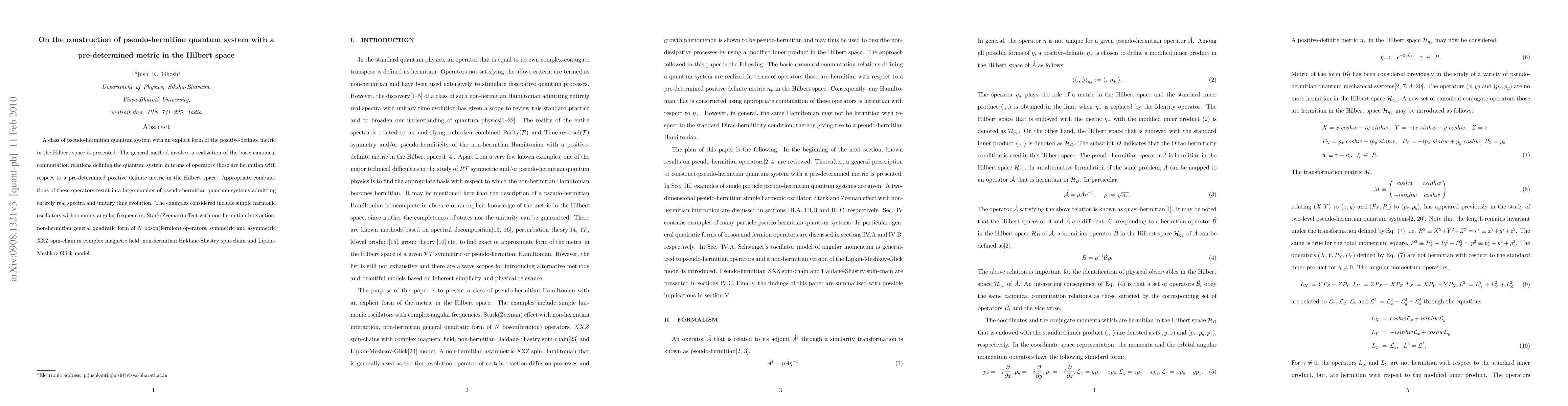 A class of pseudo-hermitian quantum system with an explicit form of the positive-definite metric in the Hilbert space is presented. The general method involves a realization of the basic canonical commutation relations defining the quantum system in terms of operators those are hermitian with respect to a pre-determined positive definite metric in the Hilbert space. Appropriate combinations of these operators result in a large number of pseudo-hermitian quantum systems admitting entirely real spectra and unitary time evolution. The examples considered include simple harmonic oscillators with complex angular frequencies, Stark(Zeeman) effect with complex electric(magnetic) field, non-hermitian general quadratic form of N boson(fermion) operators, symmetric and asymmetric XXZ spin-chain in complex magnetic field, non-hermitian Haldane-Shastry spin-chain and Lipkin-Meshkov-Glick model.