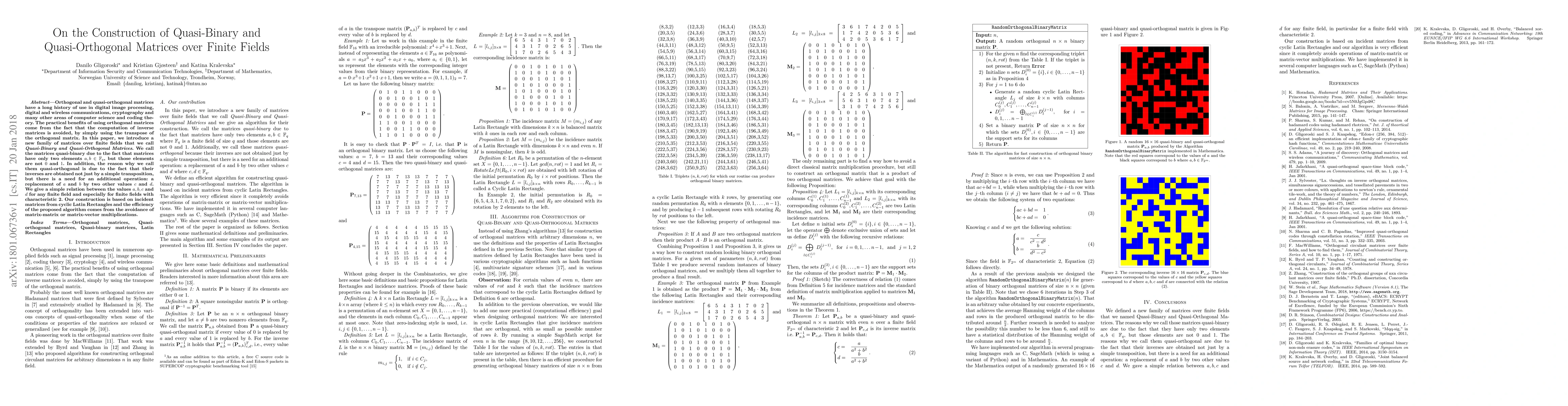 This paper introduces Quasi-Binary and Quasi-Orthogonal Matrices over finite fields, offering a new family of matrices with efficient computation properties for applications like digital image processing and cryptography.