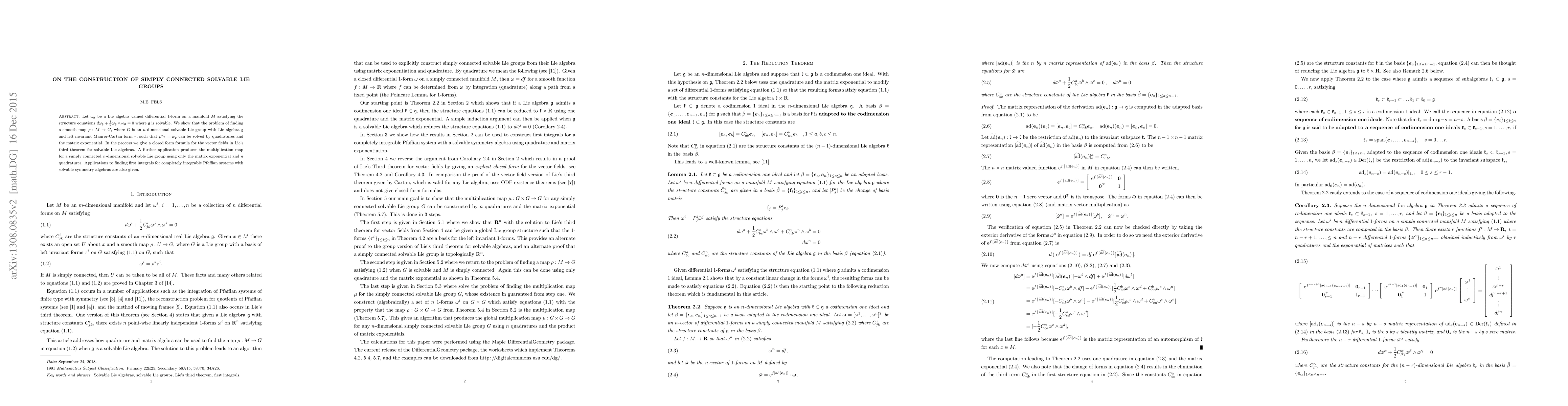 This paper constructs simply connected solvable Lie groups by solving a differential form equation using the matrix exponential and quadratures. It provides a closed form for vector fields in Lie's third theorem and applications to integrable Pfaffian systems.