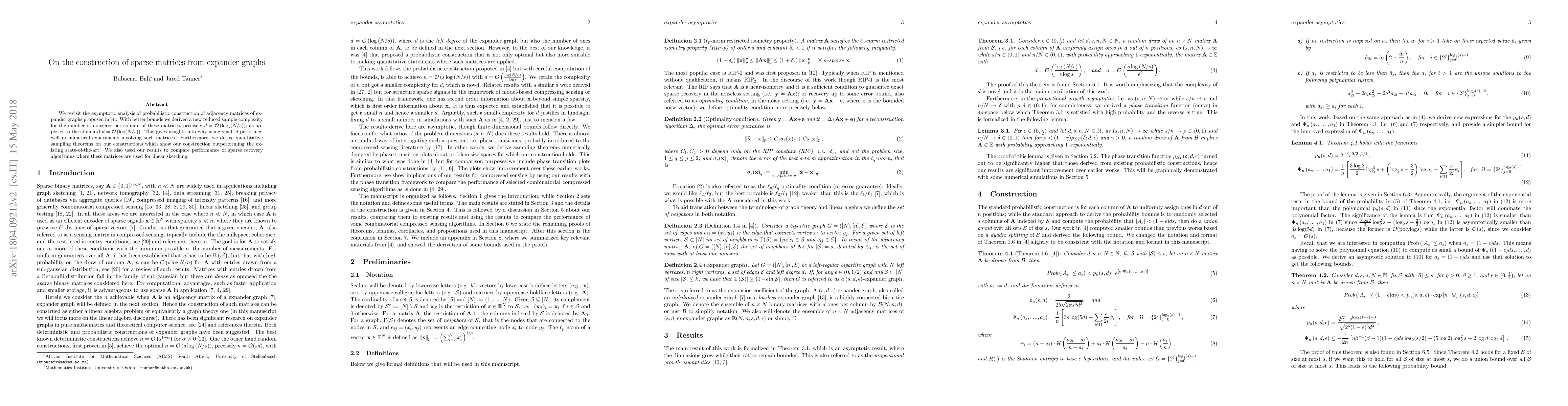 This research improves the asymptotic analysis of probabilistic construction of adjacency matrices for expander graphs, reducing sample complexity to $d = mathcal{O}(log_s(N/s))$ from the previous $d = mathcal{O}(log(N/s))$. It also presents quantitative sampling theorems demonstrating superior performance of these new constructions over existing methods, with implications for sparse recovery algorithms using such matrices for linear sketching.