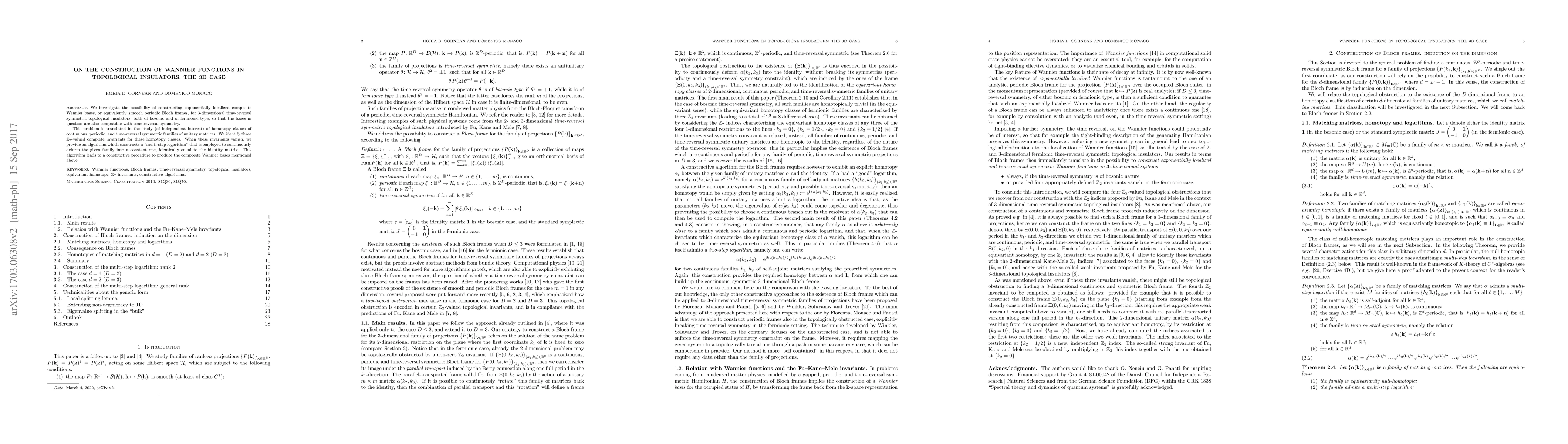 This paper explores the construction of exponentially localized Wannier functions for 3D topological insulators, focusing on time-reversal symmetric systems. It identifies $\mathbb{Z}_2$-valued invariants for homotopy classes of time-reversal symmetric unitary matrices and provides an algorithm to construct these Wannier bases.