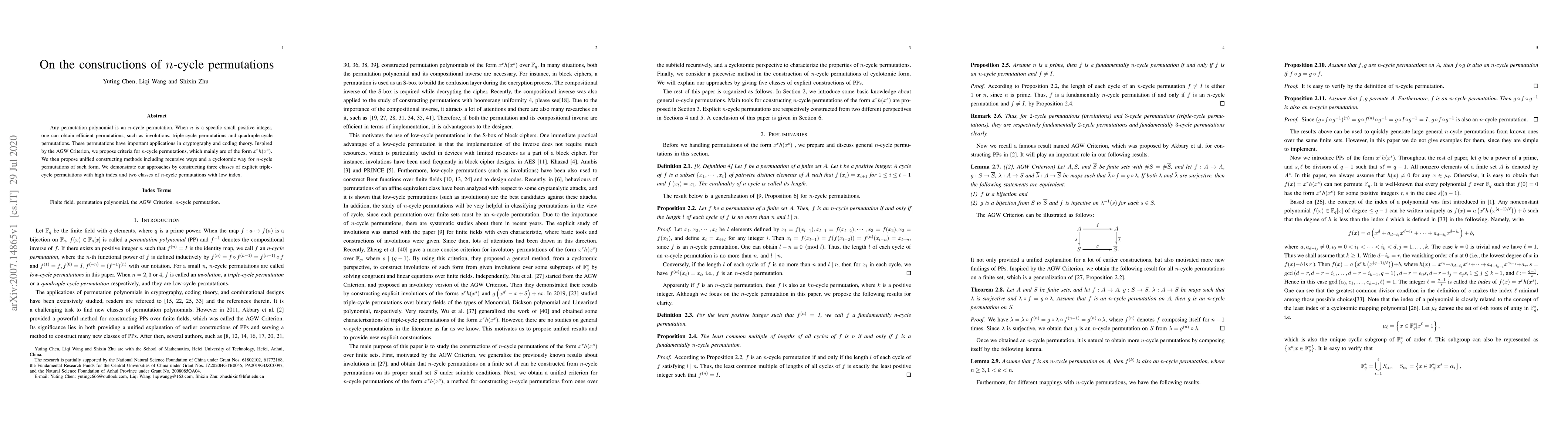 This paper proposes criteria and construction methods for $n$-cycle permutations, particularly focusing on triple-cycle permutations. It introduces recursive and cyclotomic approaches for constructing these permutations, demonstrating their application through specific examples in cryptography and coding theory.