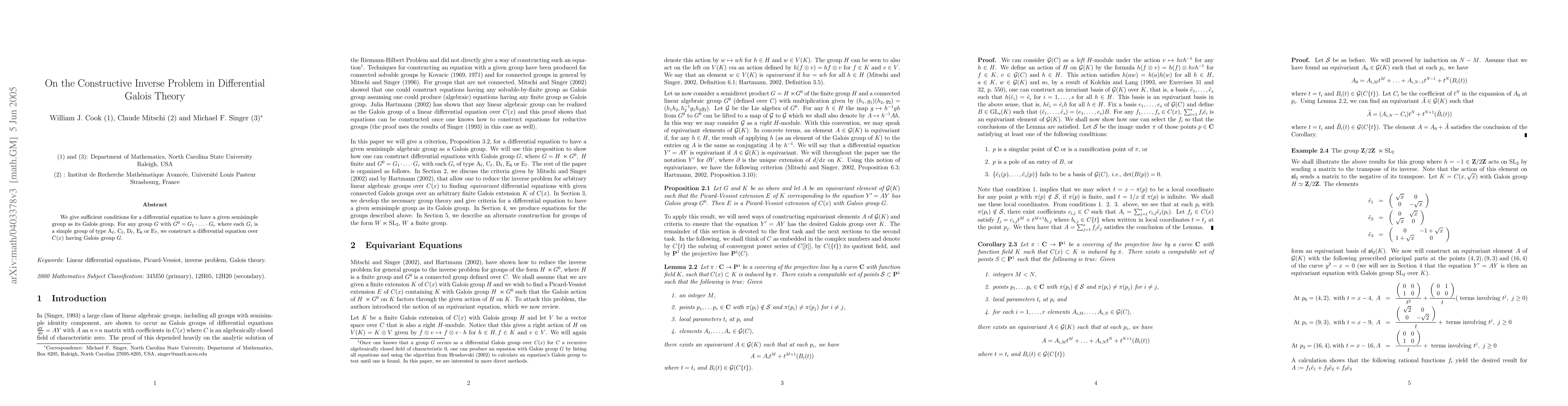 We give sufficient conditions for a linear differential equation to have a given semisimple group as its Galois group. For any linear algebraic group G given as a semidirect product of a finite subgroup and a normal subgroup that is a product of groups of type An, Cn, Dn, E6, or E7, we construct a differential equation over C(x) having Galois group G.