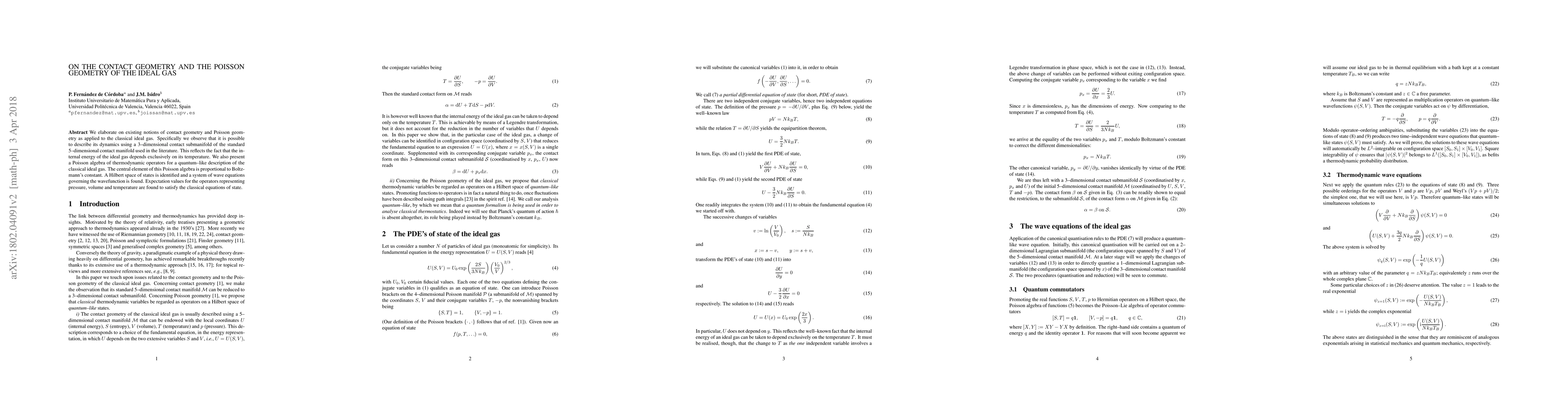We elaborate on existing notions of contact geometry and Poisson geometry as applied to the classical ideal gas. Specifically we observe that it is possible to describe its dynamics using a 3-dimensional contact submanifold of the standard 5-dimensional contact manifold used in the literature. This reflects the fact that the internal energy of the ideal gas depends exclusively on its temperature. We also present a Poisson algebra of thermodynamic operators for a quantum-like description of the classical ideal gas. The central element of this Poisson algebra is proportional to Boltzmann's constant. A Hilbert space of states is identified and a system of wave equations governing the wavefunction is found. Expectation values for the operators representing pressure, volume and temperature are found to satisfy the classical equations of state.