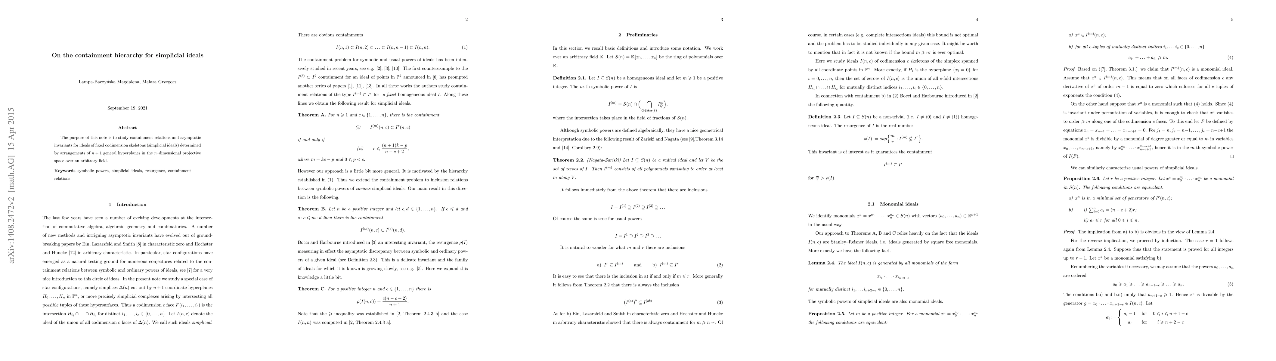 The purpose of this note is to study containment relations and asymptotic invariants for ideals of fixed codimension skeletons (simplicial ideals) determined by arrangements of $n + 1$ general hyperplanes in the $n-$dimensional projective space over an arbitrary field.