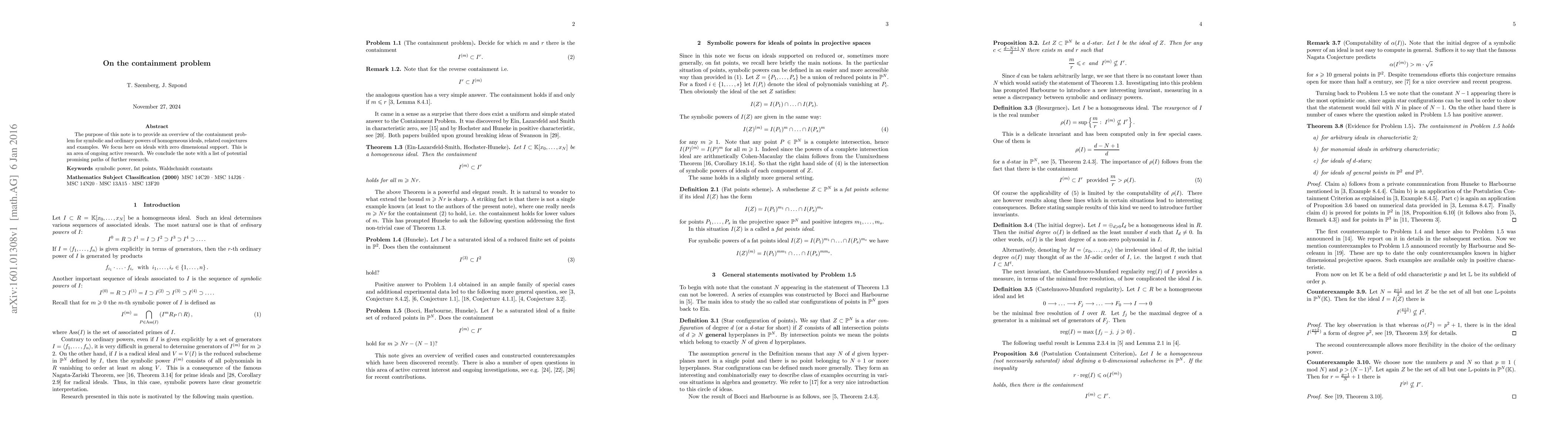 The purpose of this note is to provide an overview of the containment problem for symbolic and ordinary powers of homogeneous ideals, related conjectures and examples. We focus here on ideals with zero dimensional support. This is an area of ongoing active research. We conclude the note with a list of potential promising paths of further research.
