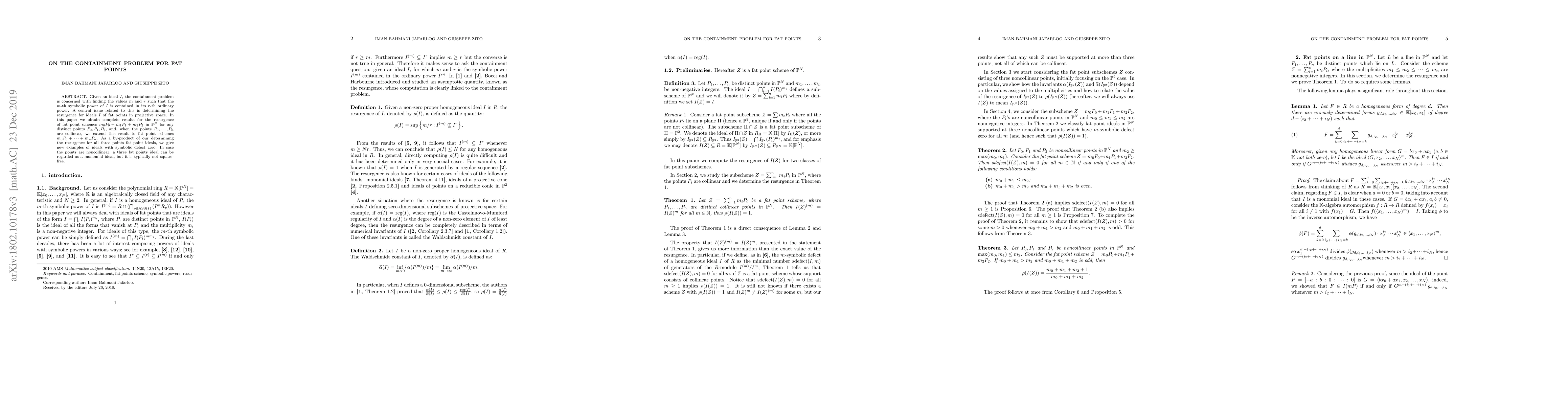 Researchers studied the containment problem for fat points in algebraic geometry, focusing on ideals of n points on a line and three nonlinear points in higher-dimensional space.