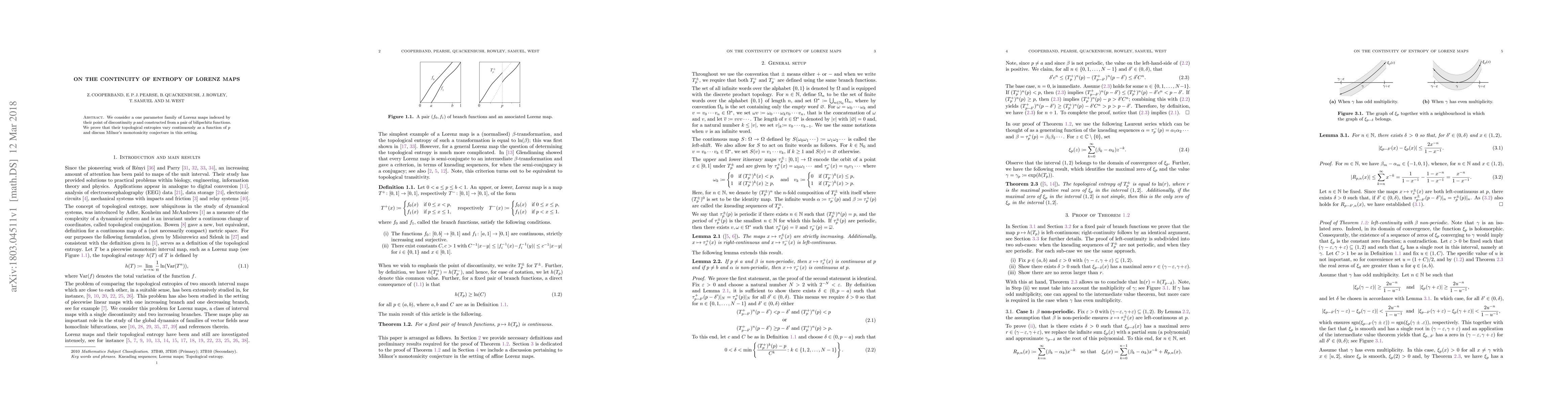 This paper investigates how the topological entropy of Lorenz maps changes as a parameter $p$ is varied, finding that it varies continuously with $p$. The research contributes to understanding Milnor's monotonicity conjecture in this context.