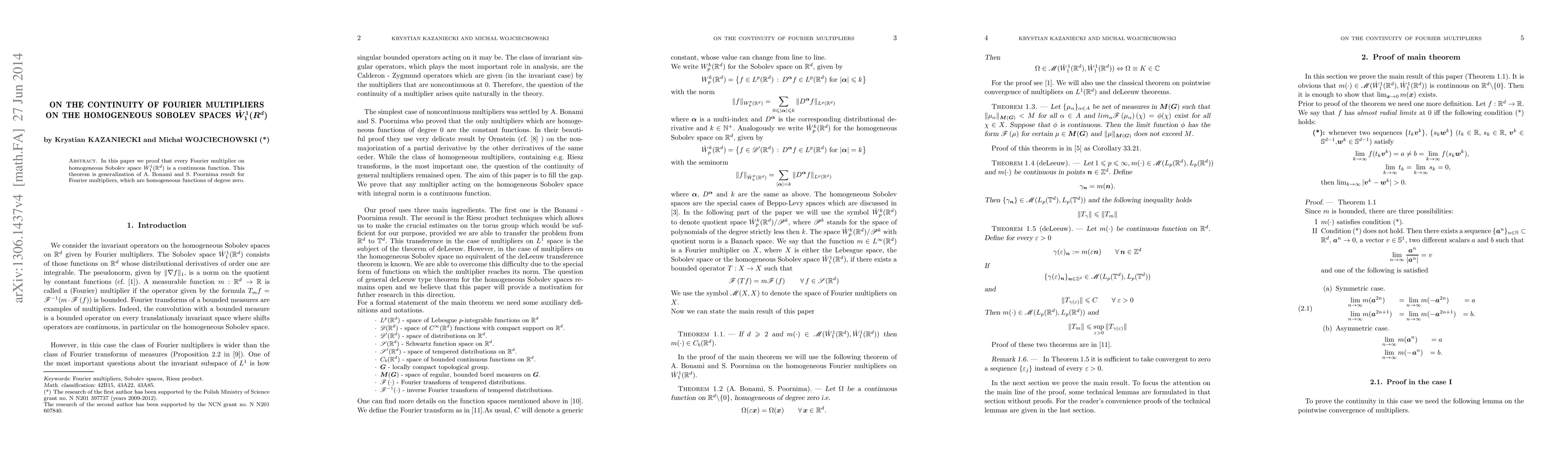 In this paper we proof that every Fourier multiplier on homogeneous sobolev space $\dot{W}_1^1(\mathbb{R}^d)$ is a continuous function. Our theorem is generalization of A. Bonami and S. Poornima result for Fourier multipliers, which are homogeneous functions of degree zero.