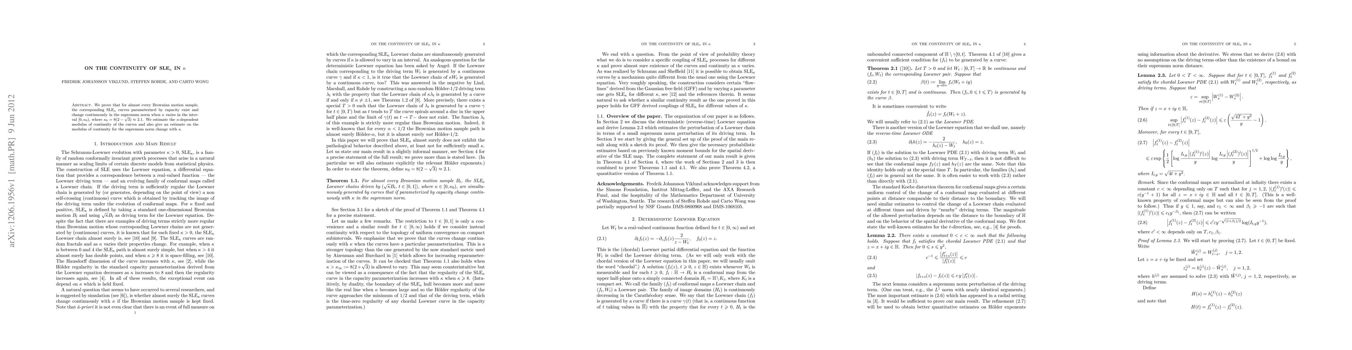 This paper proves the continuity of SLE(\kappa) curves parameterized by capacity for almost every Brownian motion sample as \kappa varies in [0, \kappa_0), where \kappa_0 ≈ 2.143. It also estimates the \kappa-dependent modulus of continuity for these curves and provides an estimate for the supremum norm change with \kappa.