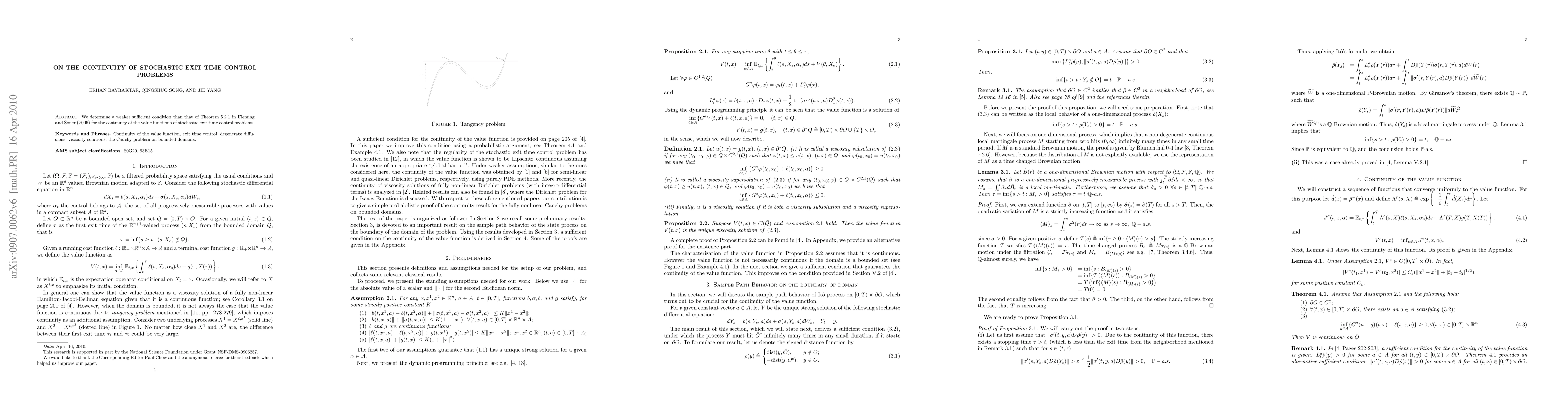 We determine a weaker sufficient condition than that of Theorem 5.2.1 in Fleming and Soner (2006) for the continuity of the value functions of stochastic exit time control problems.