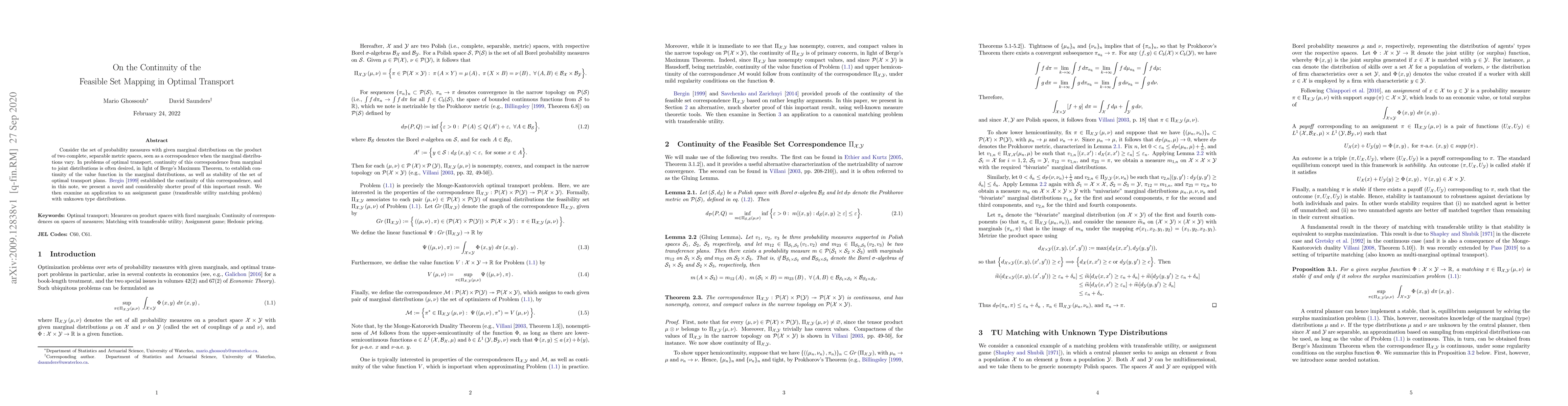 Consider the set of probability measures with given marginal distributions on the product of two complete, separable metric spaces, seen as a correspondence when the marginal distributions vary. In problems of optimal transport, continuity of this correspondence from marginal to joint distributions is often desired, in light of Berge's Maximum Theorem, to establish continuity of the value function in the marginal distributions, as well as stability of the set of optimal transport plans. Bergin (1999) established the continuity of this correspondence, and in this note, we present a novel and considerably shorter proof of this important result. We then examine an application to an assignment game (transferable utility matching problem) with unknown type distributions.