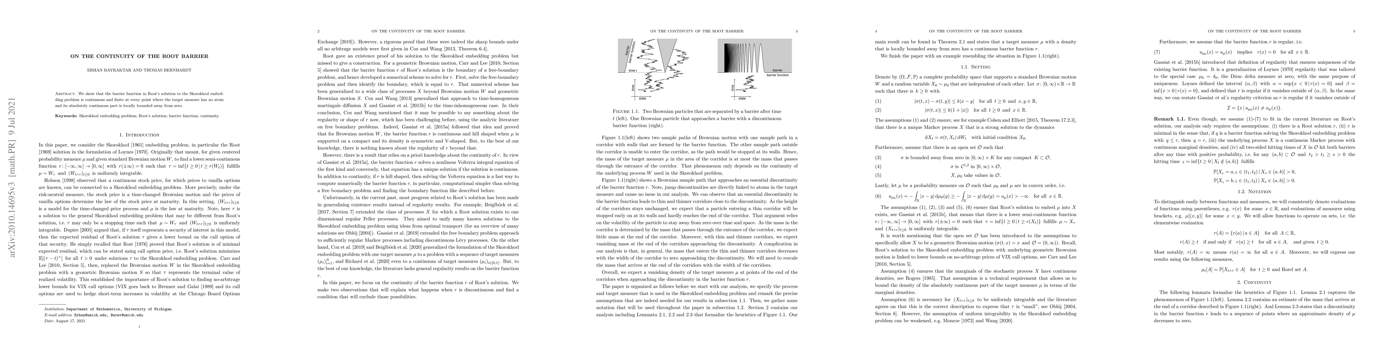 We show that the barrier function in Root's solution to the Skorokhod embedding problem is continuous and finite at every point where the target measure has no atom and its absolutely continuous part is locally bounded away from zero.