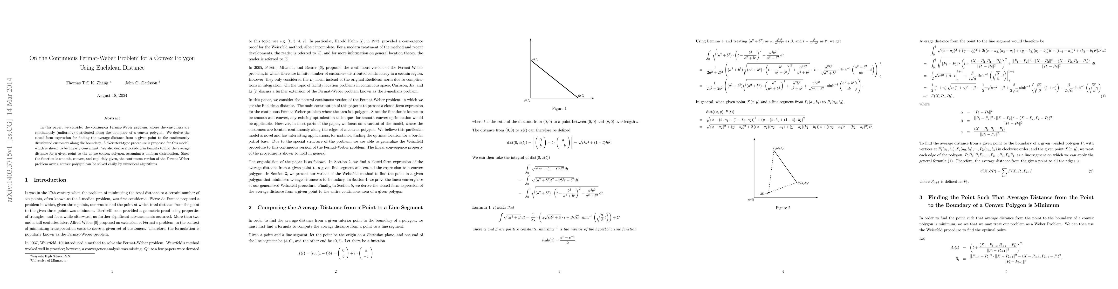 This paper addresses the continuous Fermat-Weber problem for a convex polygon, deriving a closed-form expression for the average distance from a point to uniformly distributed customers on its boundary. It proposes a Weiszfeld-type algorithm with linear convergence and provides a closed-form formula for the average distance to the entire polygon.