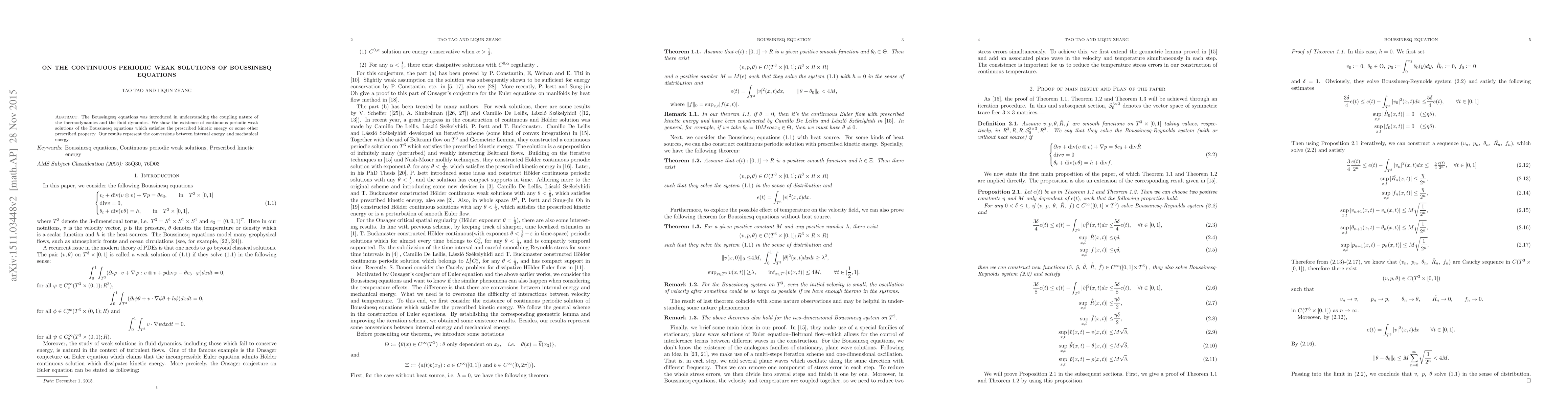 The Boussingesq equations was introduced in understanding the coupling nature of the thermodynamics and the fluid dynamics. We show the existence of continuous periodic weak solutions of the Boussinesq equations which satisfies the prescribed kinetic energy or some other prescribed property. Our results represent the conversions between internal energy and mechanical energy.